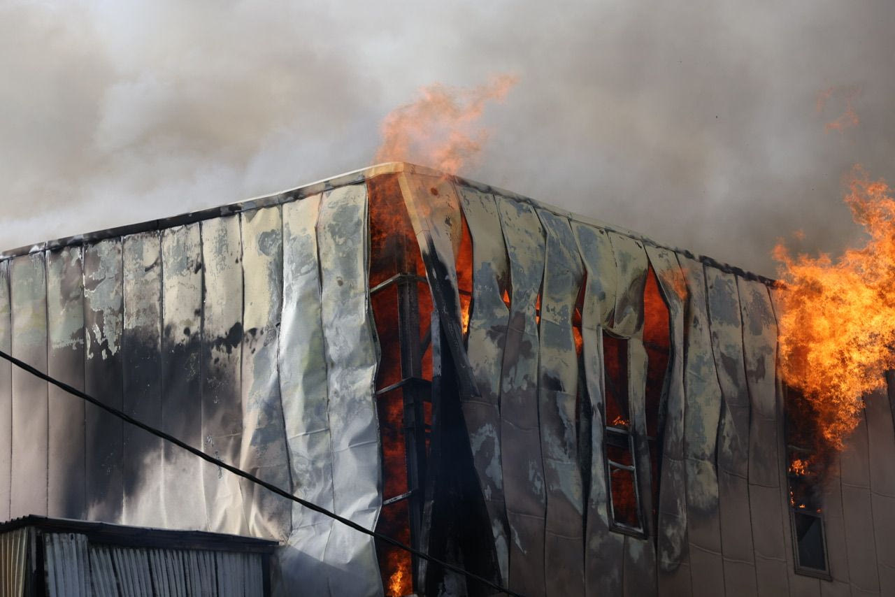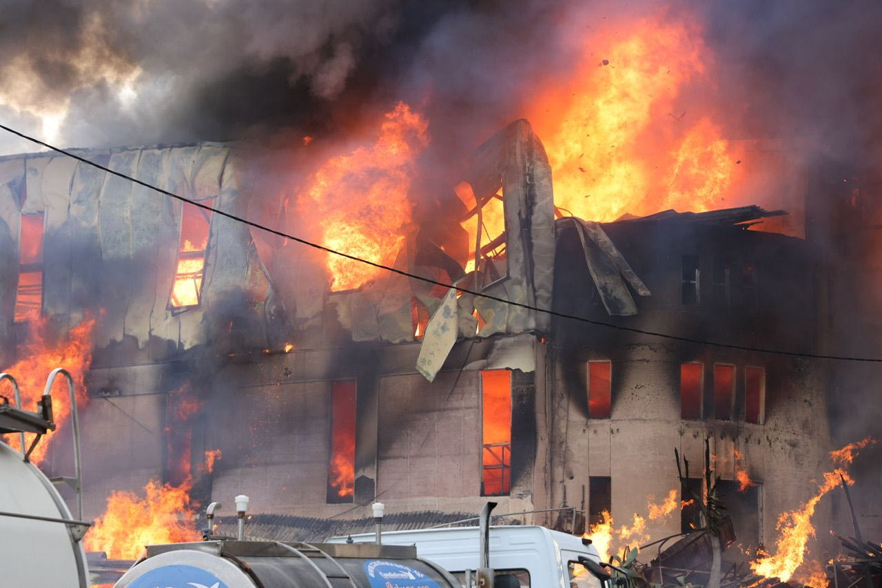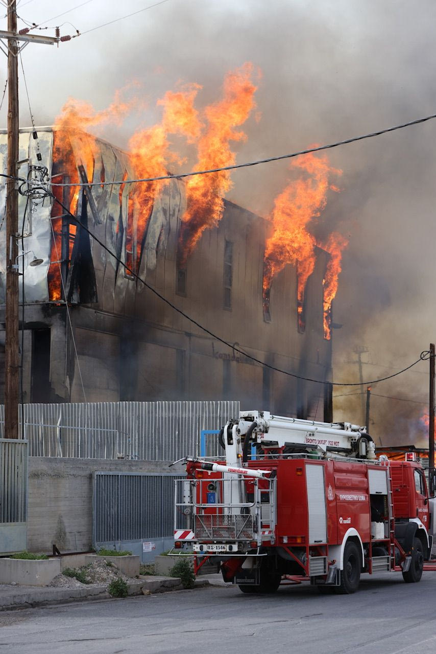 Το εργοστάσιο έχει καταστραφεί ολοσχερώς, ενώ οι ριπές ανέμου καθώς και τα εύφλεκτα υλικά ξυλείας που υπάρχουν στο χώρο δυσχεραίνουν το έργο των πυροσβεστών.