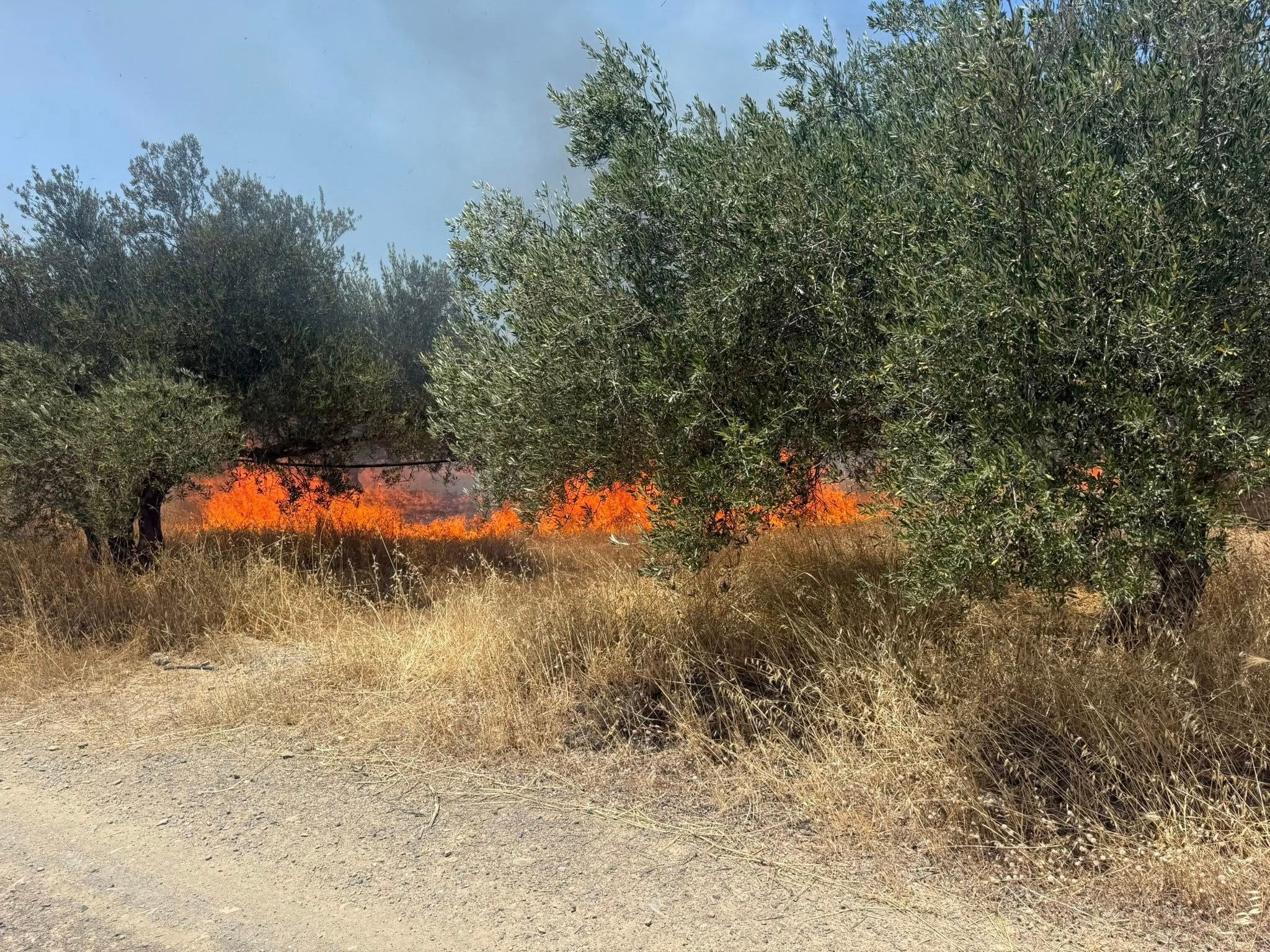 Σύμφωνα με τις πρώτες πληροφορίες η φωτιά εκδηλώθηκε σε ελαιώνα κάτω από άγνωστη μέχρι στιγμής αιτία.