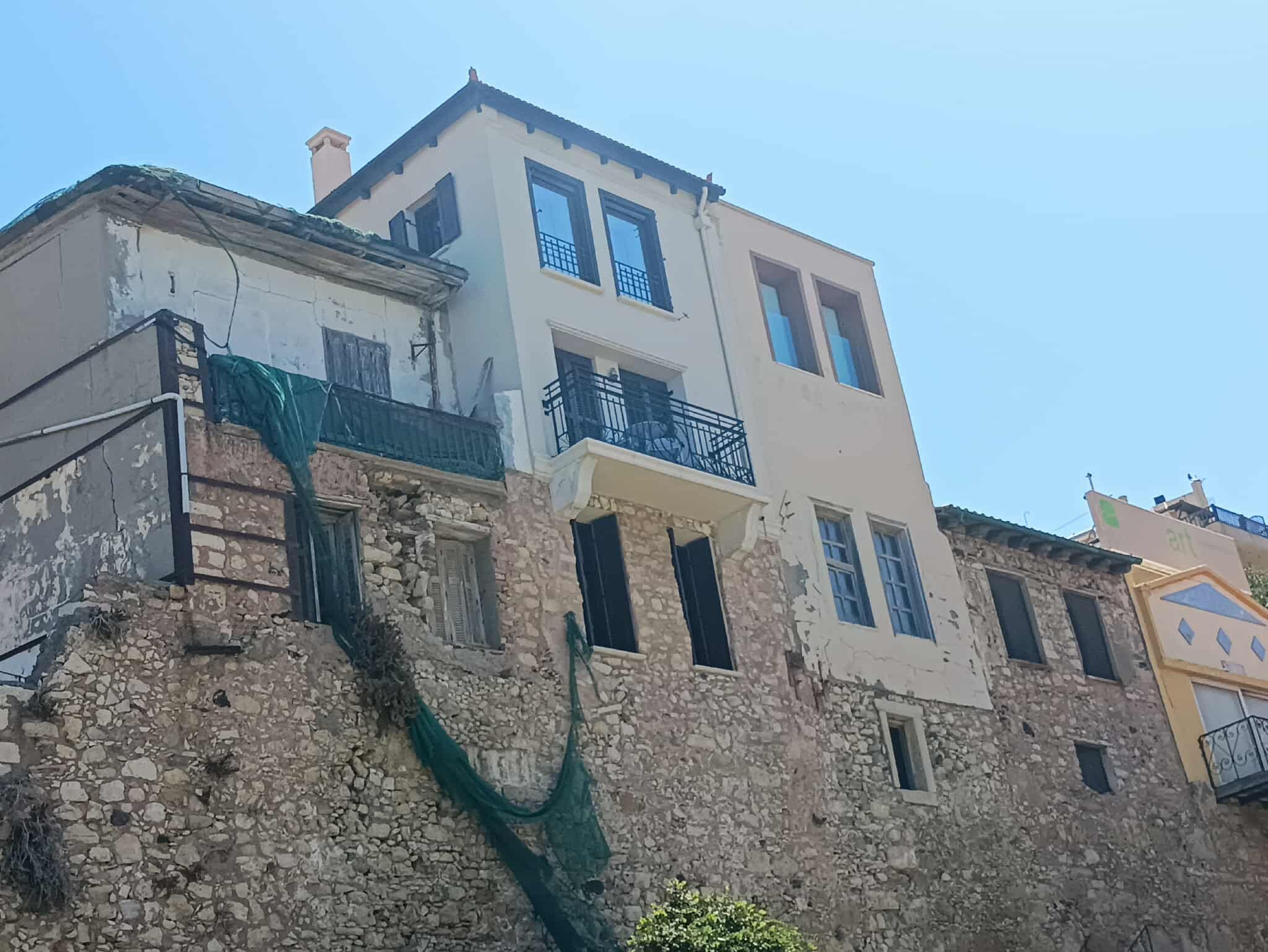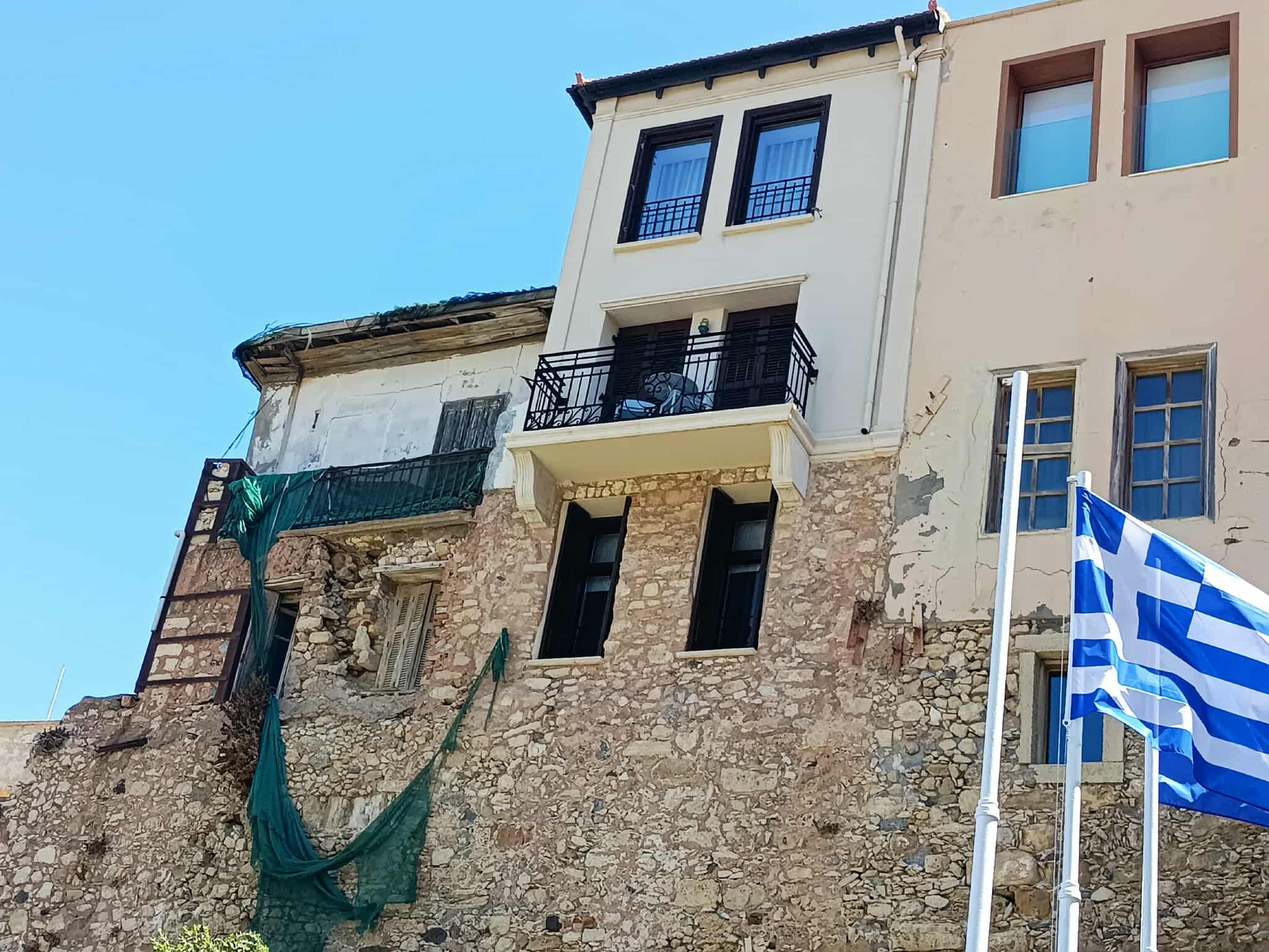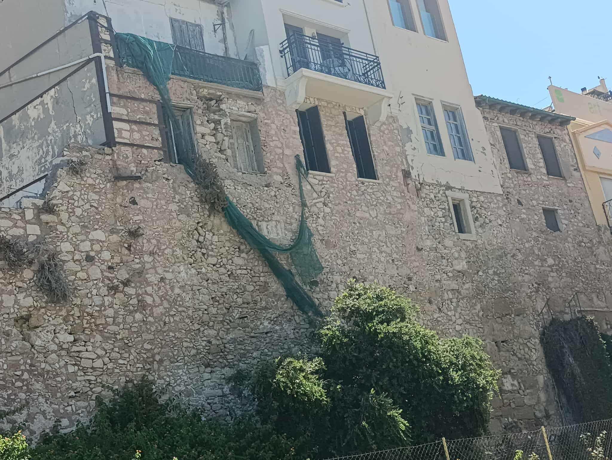 Το πράσινο δίχτυ που βλέπετε στην φωτογραφία, με δίχτυ ελαιοσυλλογής μοιάζει, είναι η πρώτη εικόνα που αντικρύζει όποιος κατηφορίσει από την πλατεία 18 Άγγλων προς το κτίριο της Αποκεντρωμένης Διοίκησης στην παραλιακή λεωφόρο.