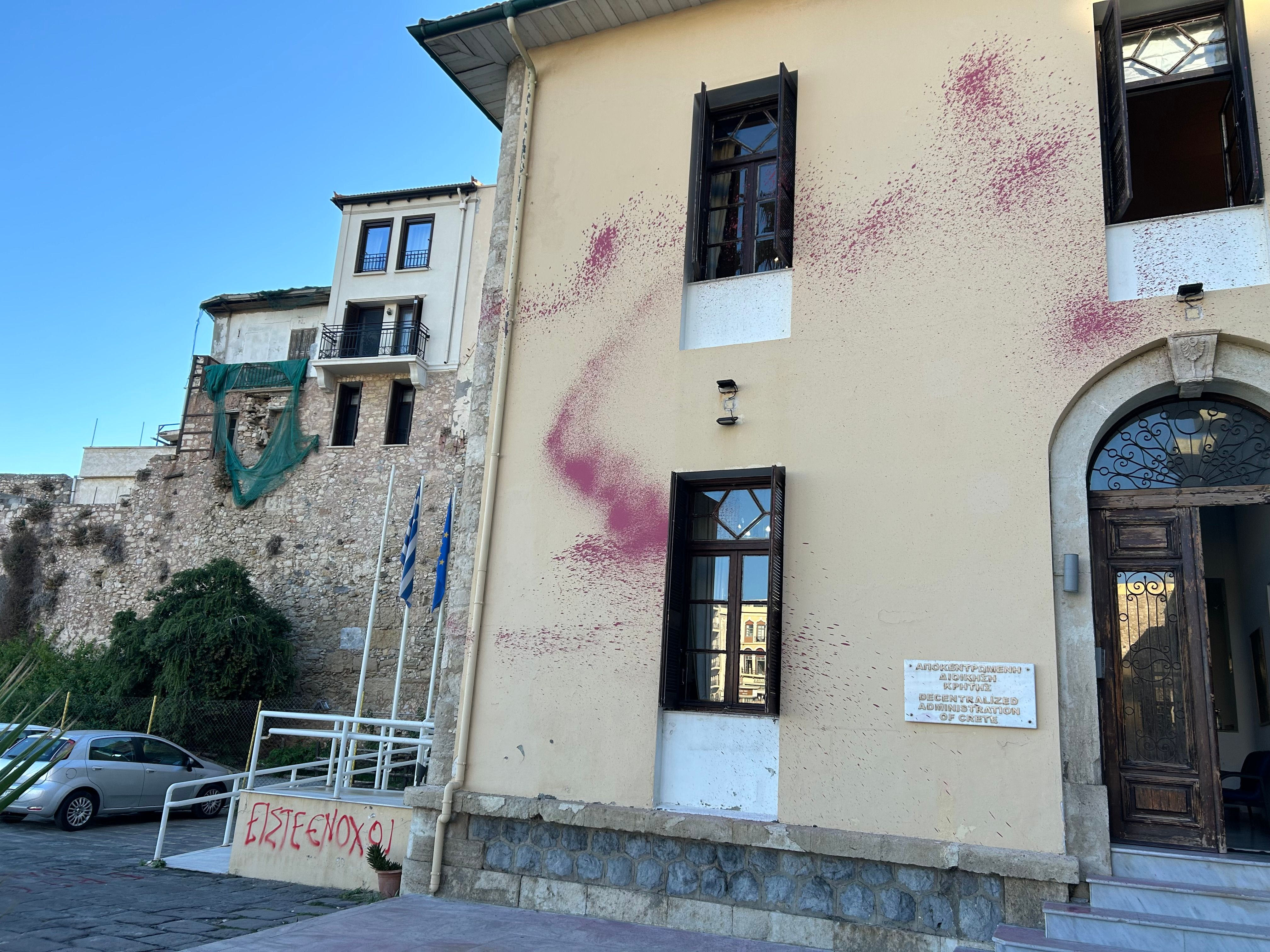 Άγνωστοι κατά την διάρκεια πορείας το απόγευμα της Τρίτης, πέταξαν μπογιές και έγραψαν συνθήματα στο κεντρικό κτίριο της Αποκεντρωμένης Διοίκησης Κρήτης, στο Ηράκλειο.