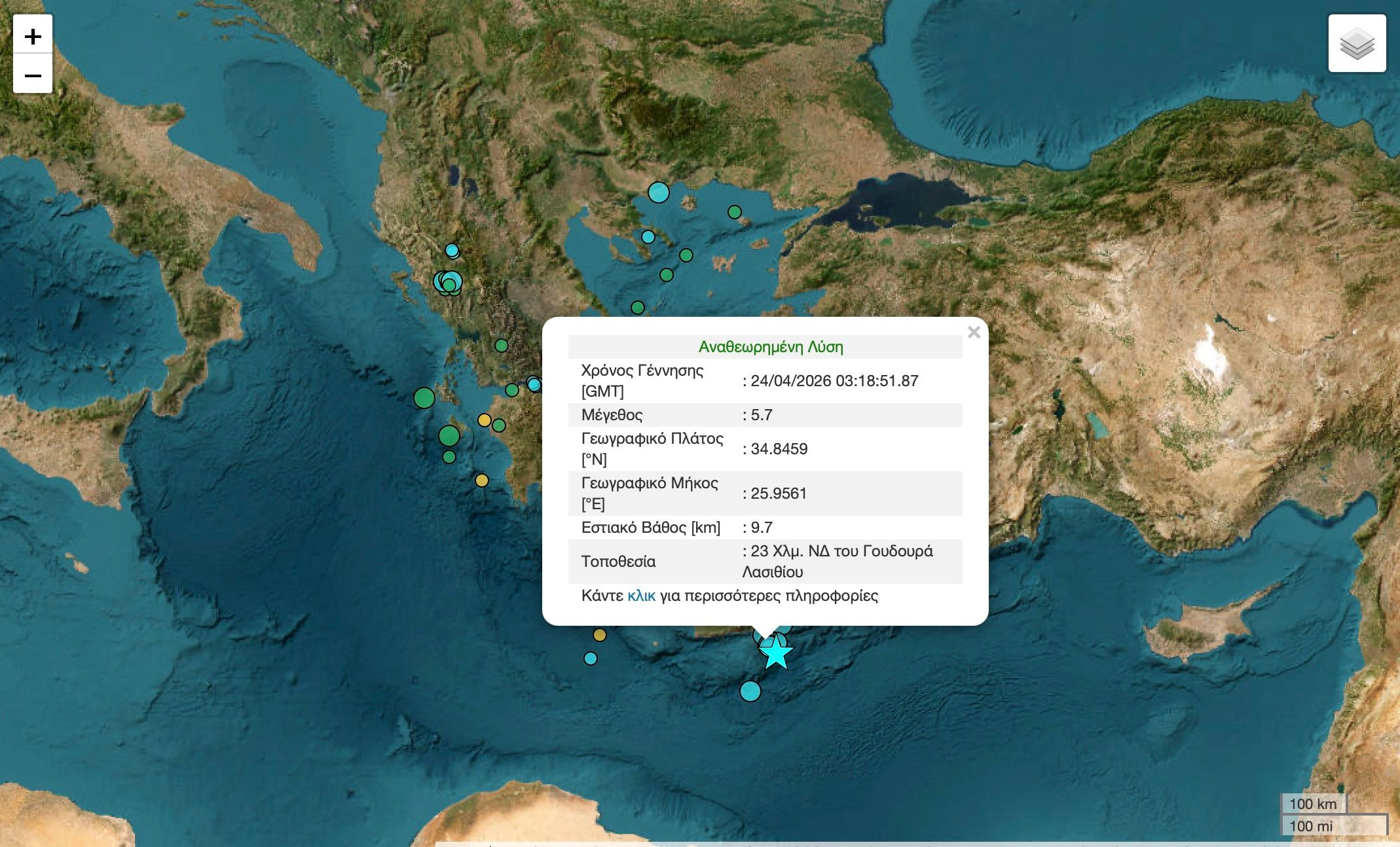 Σύμφωνα με το Γεωδυναμικό Ινστιτούτο Αθηνών ο σεισμός εντάσεως 5,7 Ρίχτερ σημειώθηκε 25 χιλιόμετρα νοτιονοτιοδυτικά του Γούδουρα Λασιθίου. Το εστιακό βάθος της δόνησης εντοπίστηκε στα 9.7 χλμ.