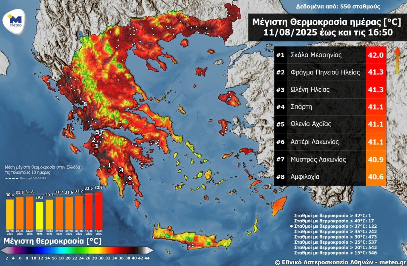 Πολύ υψηλές θερμοκρασίες καταγράφηκαν στην Ελλάδα σήμερα Δευτέρα, με τη μέγιστη θερμοκρασία στην Πελοπόννησο, να φτάνει τους 42°C.