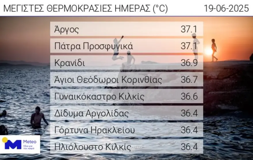 Σύμφωνα με το δίκτυο αυτόματων μετεωρολογικών σταθμών του Εθνικού Αστεροσκοπείου Αθηνών / meteo.gr οι οκτώ υψηλότερες μέγιστες θερμοκρασίες κατά τις μεσημεριανές ώρες της Πέμπτης 19/06, παρουσιάζονται στον παρακάτω Πίνακα.