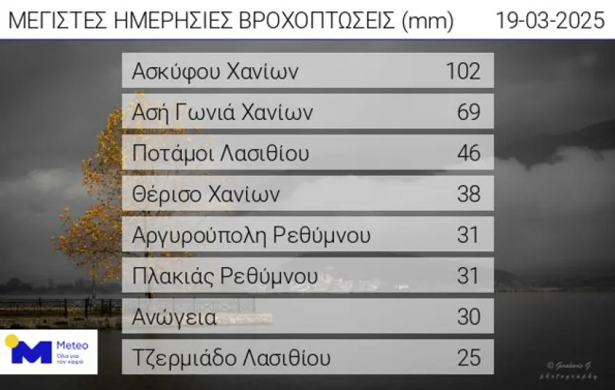 Οι σημαντικές βροχοπτώσεις στην Κρήτη και οι ενισχυμένοι βόρειοι άνεμοι στο Αιγαίο είναι δύο από τα κυριότερα χαρακτηριστικά του καιρού την Τετάρτη 19/03. Σύμφωνα με τις καταγραφές του δικτύου αυτόματων μετεωρολογικών σταθμών του meteo.gr / Εθνικού Αστεροσκοπείου Αθηνών, το μεγαλύτερο ύψος βροχής έως το μεσημέρι της Τετάρτης 19/03 καταγράφηκε στο Ασκύφου Χανίων (102 χιλιοστά) και ακολούθησαν Ασή Γωνιά Χανίων (69 χιλιοστά) και Ποτάμοι Λασιθίου (46 χιλιοστά).