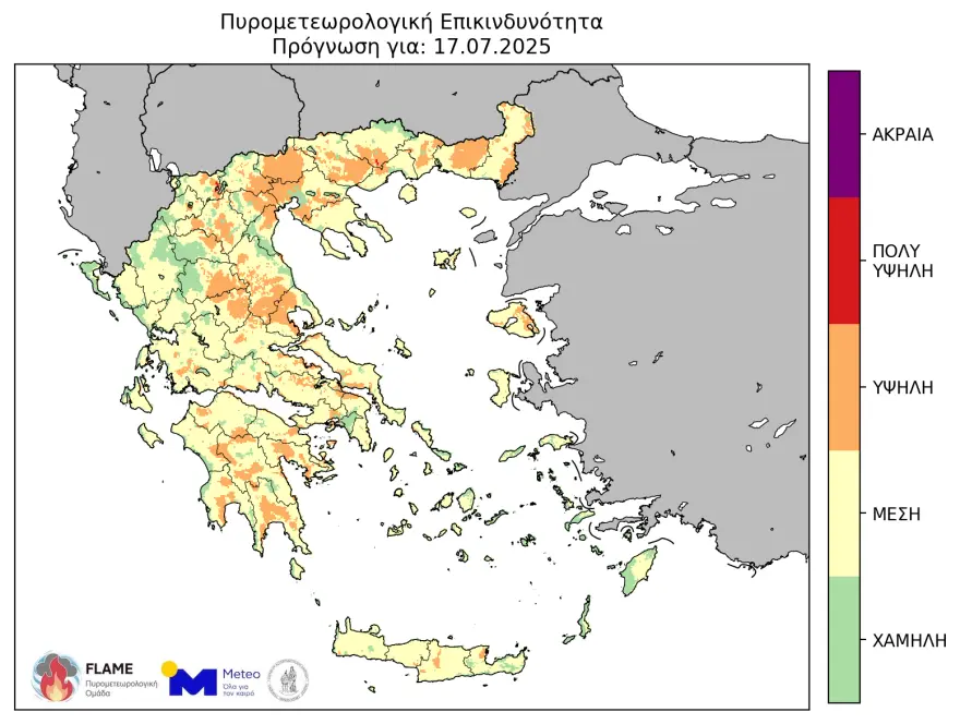 Πάντως καλύτερη είναι η εικόνα σε σχέση με τον κίνδυνο πυρκαγιάς, καθώς για σήμερα δεν υπάρχει περιοχή πολύ υψηλού κινδύνου ή σε κατάσταση συναγερμού. Το ίδιο ισχύει και για τις πυρομετεωρολογικές συνθήκες.