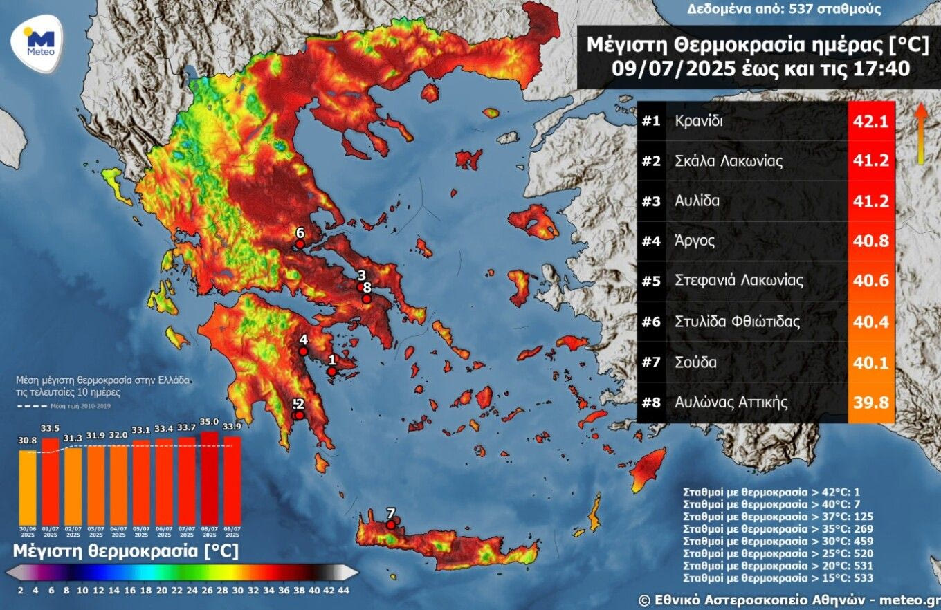 Πολύ υψηλές θερμοκρασίες επικράτησαν την Τετάρτη, κυρίως στα ανατολικά ηπειρωτικά τμήματα της χώρας, όπου ο υδράργυρος ξεπέρασε τους 42°C. Η υψηλότερη θερμοκρασία καταγράφηκε στο Κρανίδι Αργολίδας, όπου έφτασε τους 42,1°C.