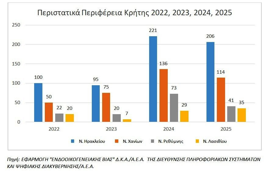 Τα παραπάνω δεδομένα εντάσσονται σε ένα ευρύτερο πλαίσιο αυξημένης ενδοοικογενειακής βίας σε όλη τη χώρα. Σύμφωνα με την ΕΛΑΣ, το διάστημα Ιανουάριος–Ιούνιος 2025 καταγράφηκαν 16.345 καταγγελίες περιστατικών ενδοοικογενειακής βίας, με το 78% των θυμάτων να είναι γυναίκες. Ο αριθμός αυτός είναι διπλάσιος σε σχέση με το αντίστοιχο διάστημα του 2023 (8.294 καταγγελίες). Αναλυτικότερα, η Αττική (ΓΑΔΑ) καταγράφει 4.434 περιστατικά, η Θεσσαλονίκη (ΓΑΔΘ) 927, ενώ η Κρήτη καταλαμβάνει την τέταρτη θέση πανελλαδικά, με 725 καταγγελίες.