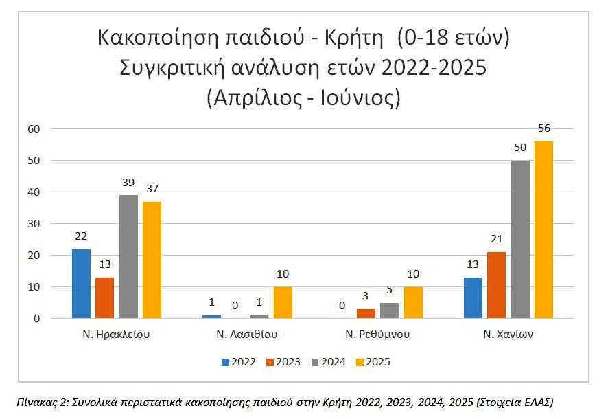 Ανησυχητική αύξηση των καταγγελιών για περιστατικά κακοποίησης παιδιών (0–18 ετών) καταγράφεται σε όλη την Κρήτη, σύμφωνα με τα στοιχεία από την ΕΛΑΣ, όπως παρουσιάζεται στην 5η Έκθεση του “Παρατηρητηρίου για τη Βία κατά των Γυναικών στην Κρήτη – WOMEN_WATCH”, με Φορέα Υλοποίησης τον «Σύνδεσμο Μελών Γυναικείων Σωματείων Ηρακλείου και Ν. Ηρακλείου».