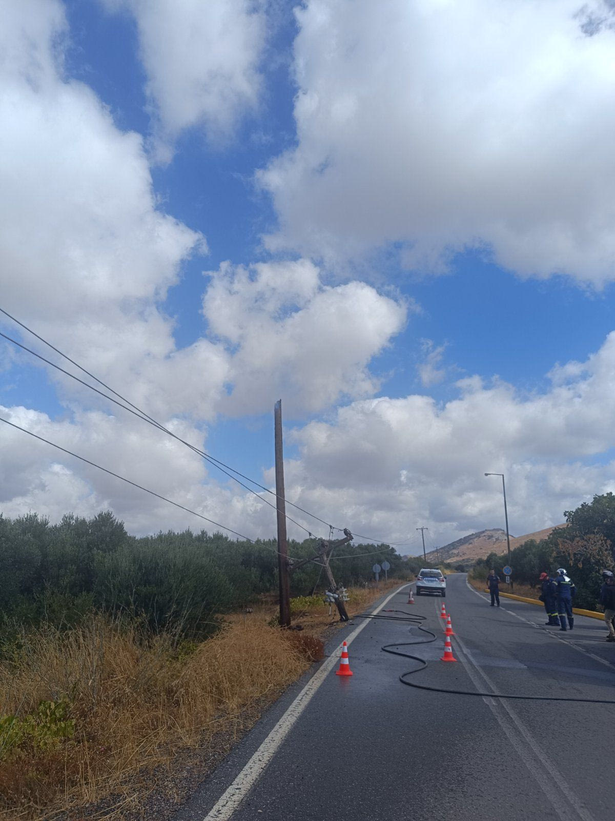 Οι εντυπωσιακές φωτογραφίες δείχνουν ότι τμήμα του στύλου έχει κοπεί – άγνωστο πώς- και έπεσε στο δρόμο, λίγο έξω από το Καστέλι.