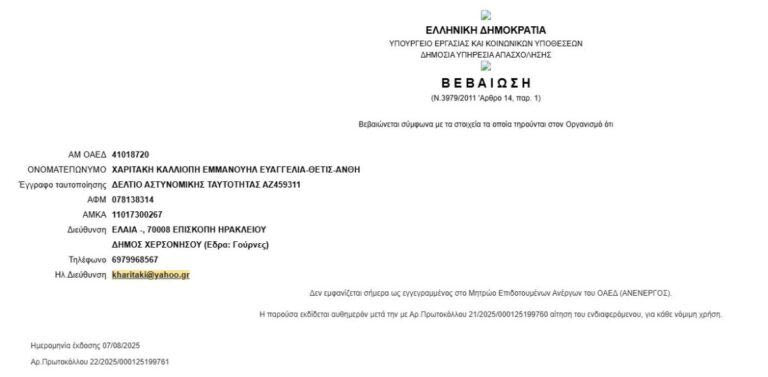 “Μου έκοψαν τα δύο ολόκληρα χρόνια ανεργίας μου αντικαθιστώντας την ημερομηνία με την ημερομηνία λήξης του τότε σεμιναρίου δηλαδή 15/9/2024!!!!! ενώ είχαν ενημερωθεί και από μένα αλλά και από τον φορέα, το επιμελητήριο Ηρακλείου και μου διέγραψαν επίσης παρανόμως και το ατομικό σχέδιο δράσης που είχε συνταχθεί από κάποιο εργασιακό σύμβουλο της ΔΥΠΑ, πολλά χρόνια πριν, καθιστώντας με αυτή τη στιγμή ούτε άνεργη ούτε και εργαζόμενη που ήταν και ο απώτερος στόχος μου!!!”,