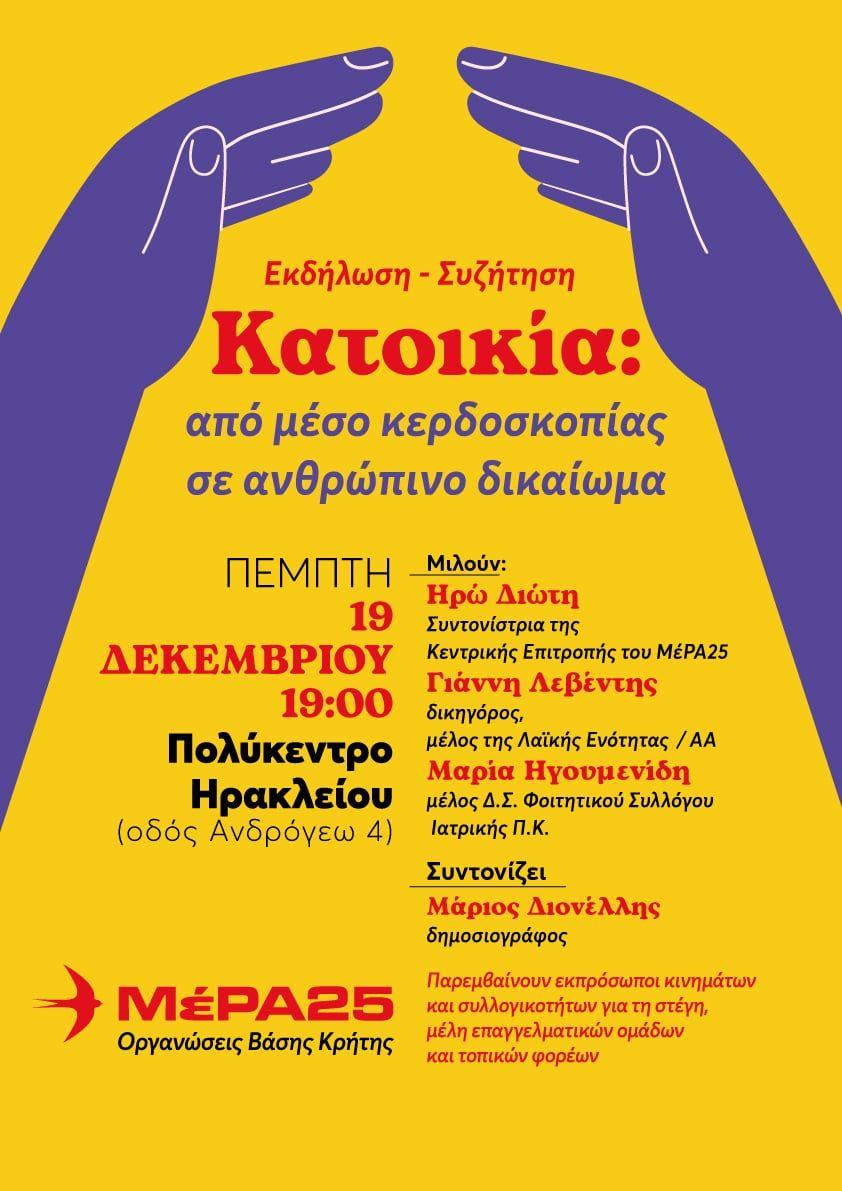Οι Οργανώσεις Βάσης Κρήτης του ΜέΡΑ25 διοργανώνουν ανοιχτή εκδήλωση – συζήτηση με θέμα: