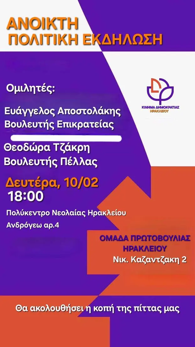 Η Ομάδα Πρωτοβουλίας Ηρακλείου του Κινήματος Δημοκρατίας καλεί τους πολίτες στην ανοικτή πολιτική εκδήλωση που διοργανώνει τη Δευτέρα 10 Φεβρουαρίου και ώρα 6μμ στο Πολύκεντρο Νεολαίας του Δήμου Ηρακλείου (Ανδρόγεω 4), με ομιλητές τον Ε. Αποστολάκη (Βουλευτής Επικρατείας) και τη Θ. Τζάκρη (Βουλευτής Πέλλας).