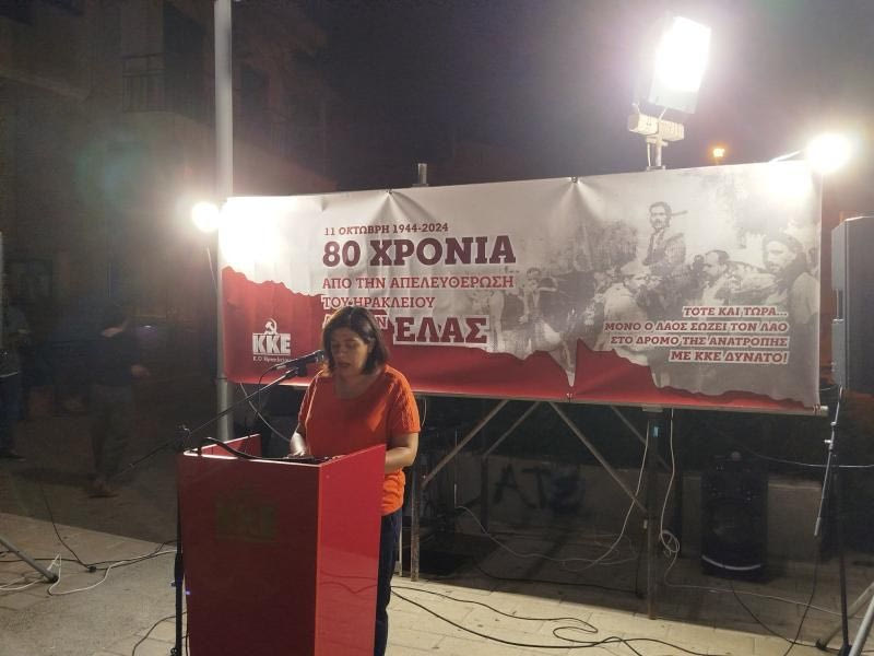 Με επιτυχία πραγματοποιήθηκε η εκδήλωση της Τομεακής Οργάνωσης Ηρακλείου του ΚΚΕ, με αφορμή την συμπλήρωση των 80 χρόνων από την απελευθέρωση του Ηρακλείου από τον ΕΛΑΣ που είχε θέμα : «80 χρόνια από την Απελευθέρωση του Ηρακλείου από τον ΕΛΑΣ. Τότε και τώρα… Μόνο ο λαός σώζει τον λαό. Στο δρόμο της ανατροπής με ΚΚΕ δυνατό!».