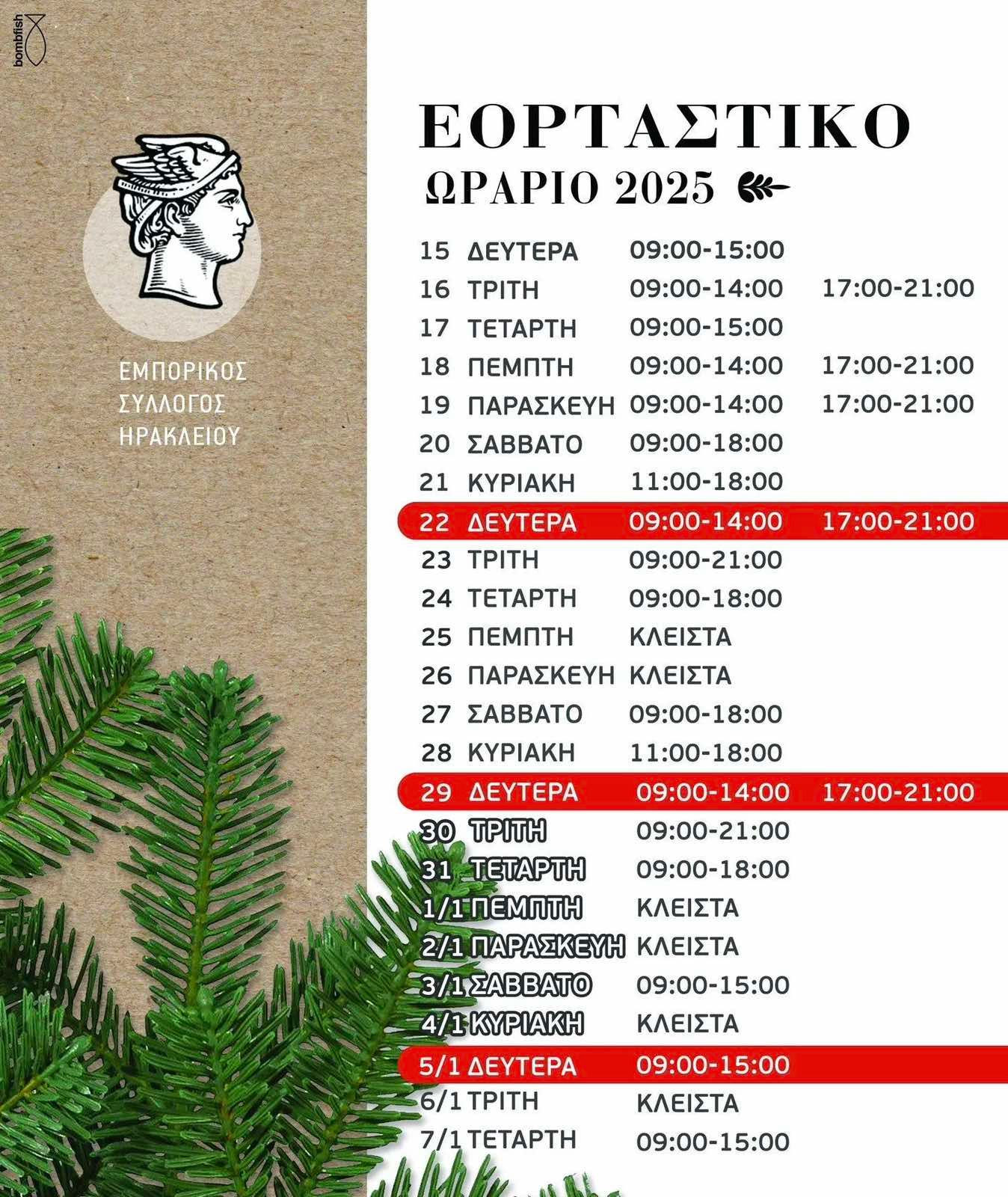Το εορταστικό ωράριο των καταστημάτων βρίσκεται σε πλήρη ισχύ από την Πέμπτη 11 Δεκεμβρίου. Στο πλαίσιο αυτό, τα καταστήματα είναι ανοιχτά και σήμερα Κυριακή (21/12) από τις 11:00 έως τις 18:00.