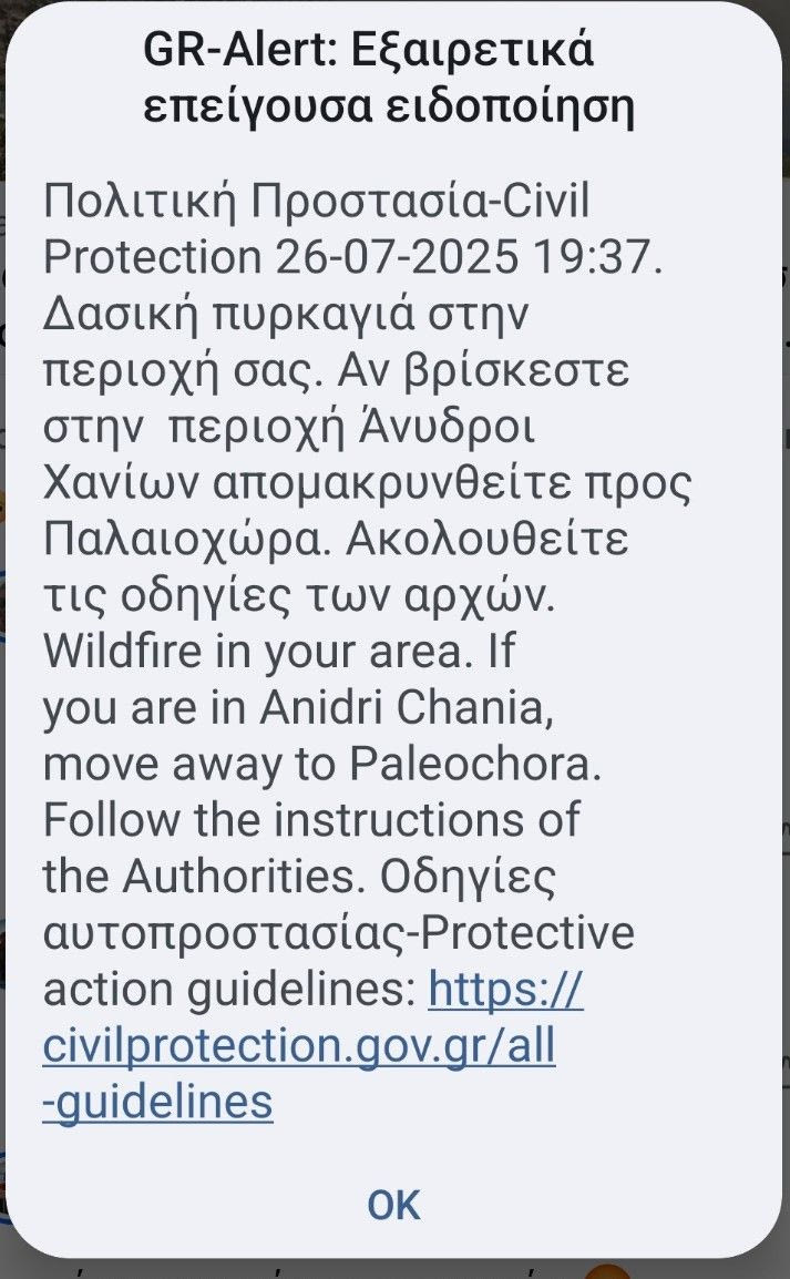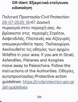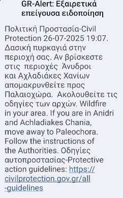 Λίγο αργότερα ήρθε νέο μήνυμα που προειδοποιεί όσους βρίσκονται στις Αχλαδιάκες και τους Ανύδρους να μετακινηθούν προς Παλαιόχωρα.
