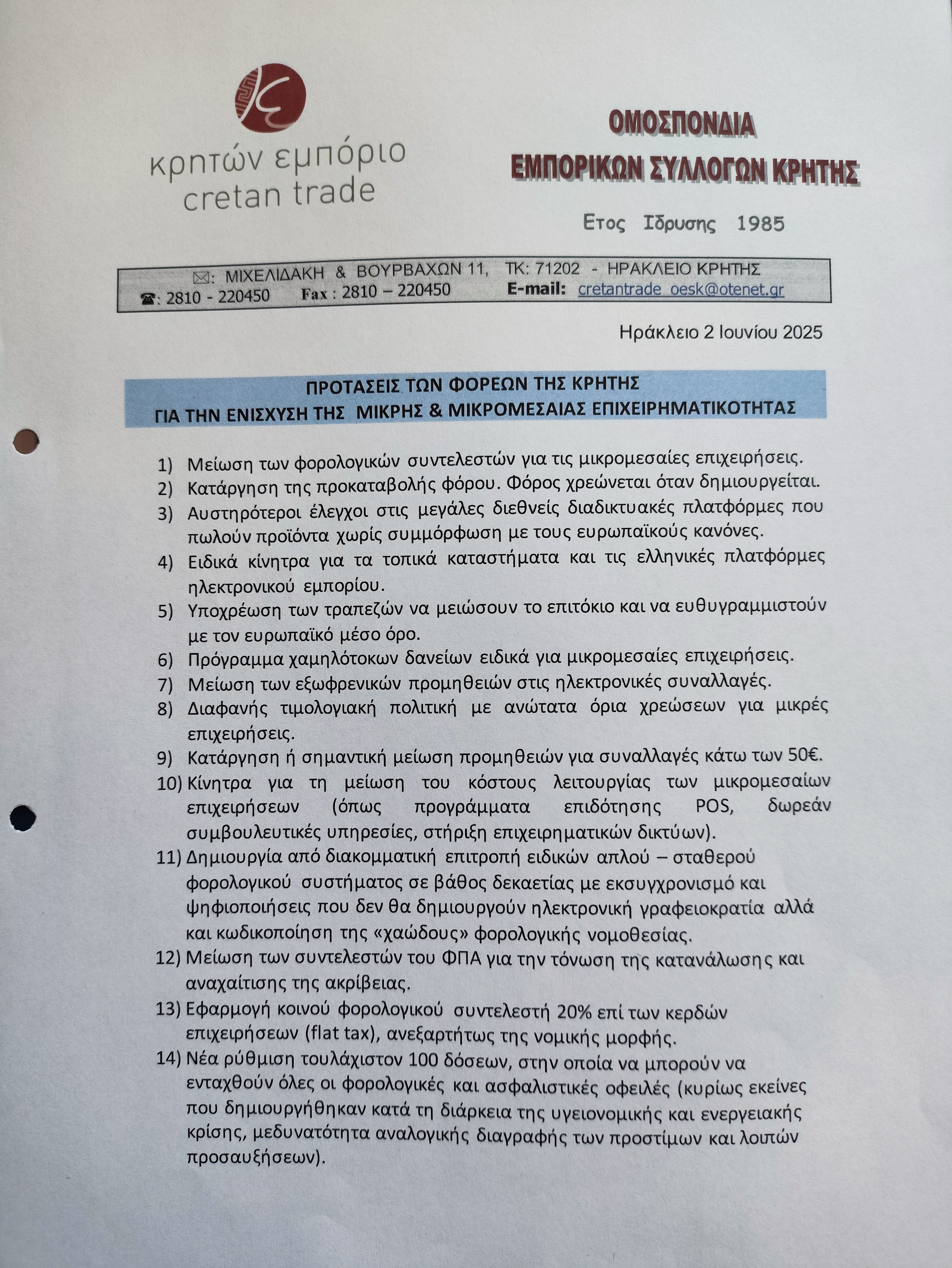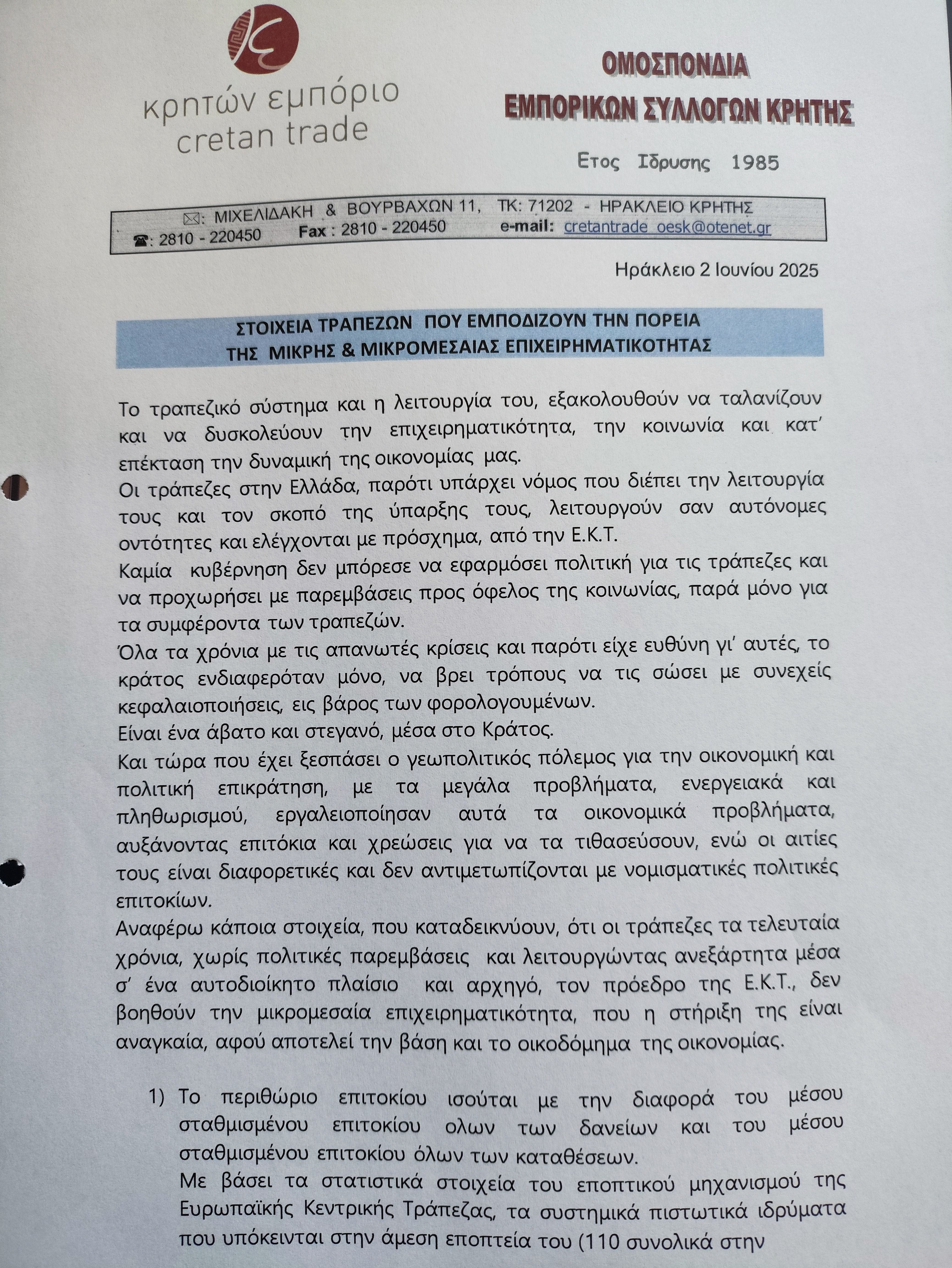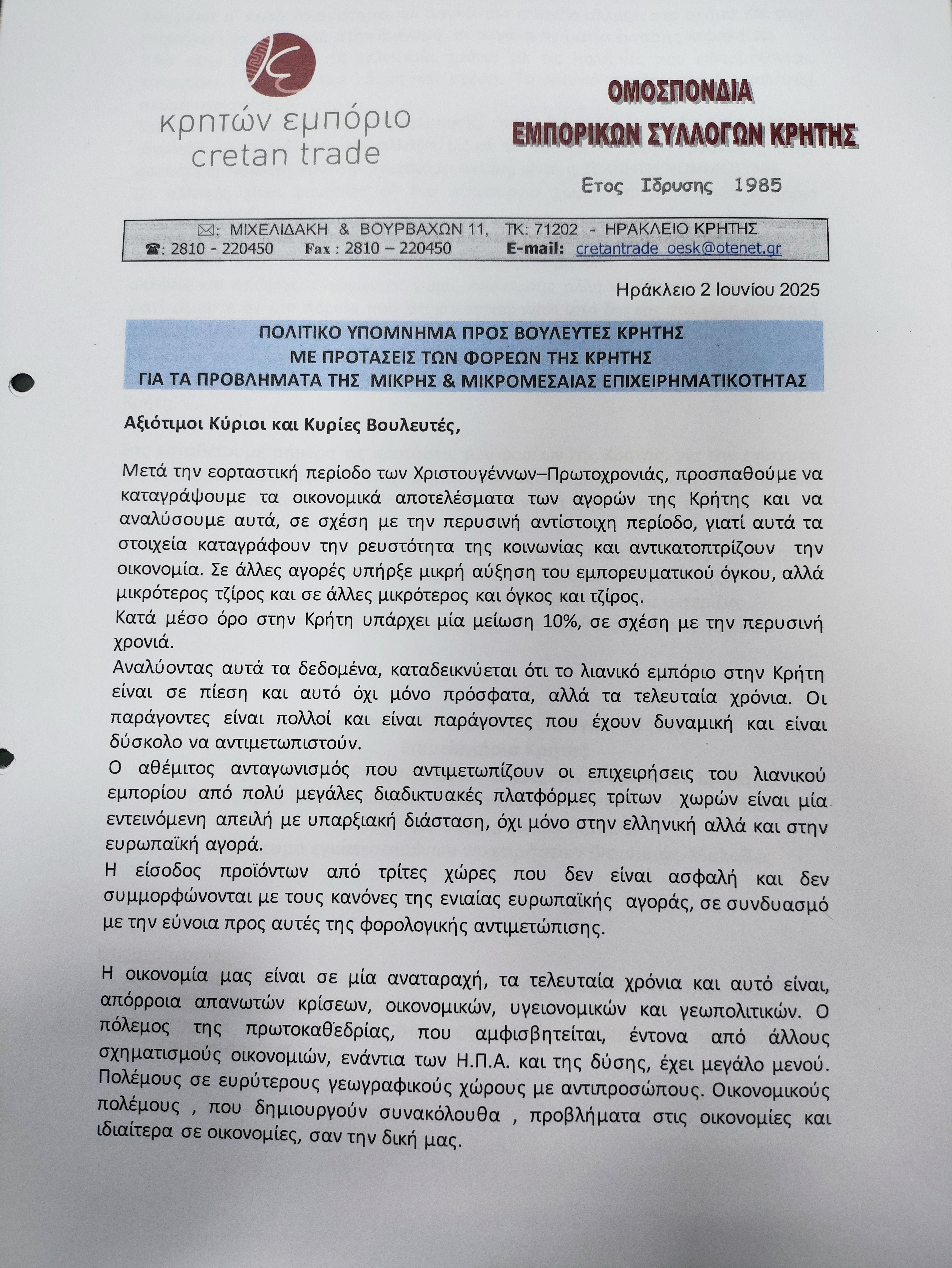 Μπροστά στο φάσμα της διαρκούς συρρίκνωσης των μικρομεσαίων επιχειρήσεων οι παραγωγικοί και εμπορικοί φορείς της Κρήτης έχουν αναλάβει δράση εδώ και μήνες. Κατέληξαν από κοινού στη σύνταξη τριών επιστολών-υπομνημάτων προς την κυβέρνηση και όλο τον πολιτικό κόσμο. Πρόκειται για ένα πολιτικό υπόμνημα, ένα υπόμνημα για την λειτουργία του τραπεζικού συστήματος και ενός πλαισίου προτάσεων για την επίλυση των προβλημάτων.