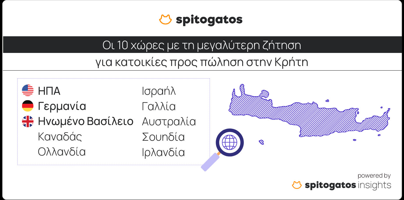 Οι χώρες με τη μεγαλύτερη ζήτηση για κατοικίες προς πώληση στην Κρήτη περιλαμβάνουν τις Ηνωμένες Πολιτείες, τη Γερμανία, το Ηνωμένο Βασίλειο, τον Καναδά, την Ολλανδία, το Ισραήλ, τη Γαλλία, την Αυστραλία, τη Σουηδία και την Ιρλανδία.