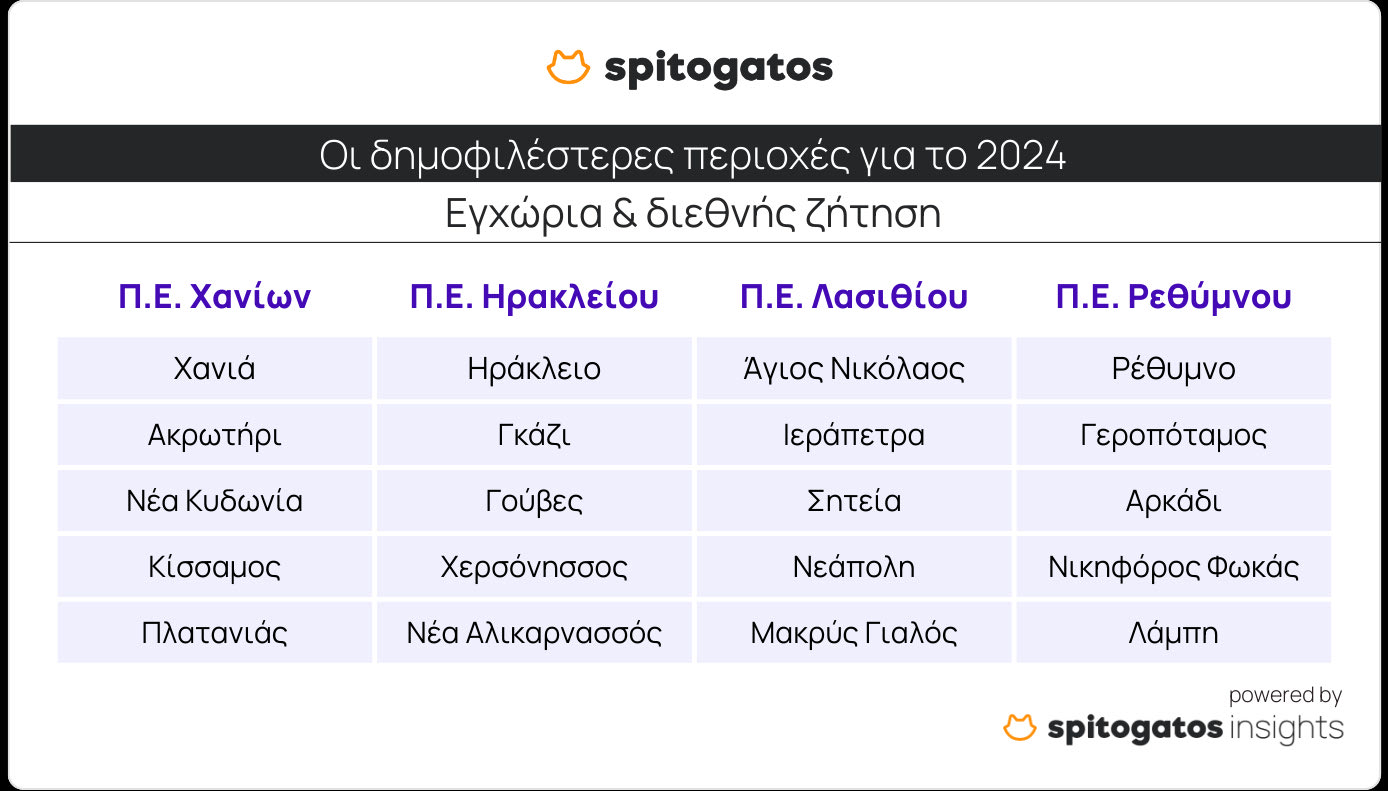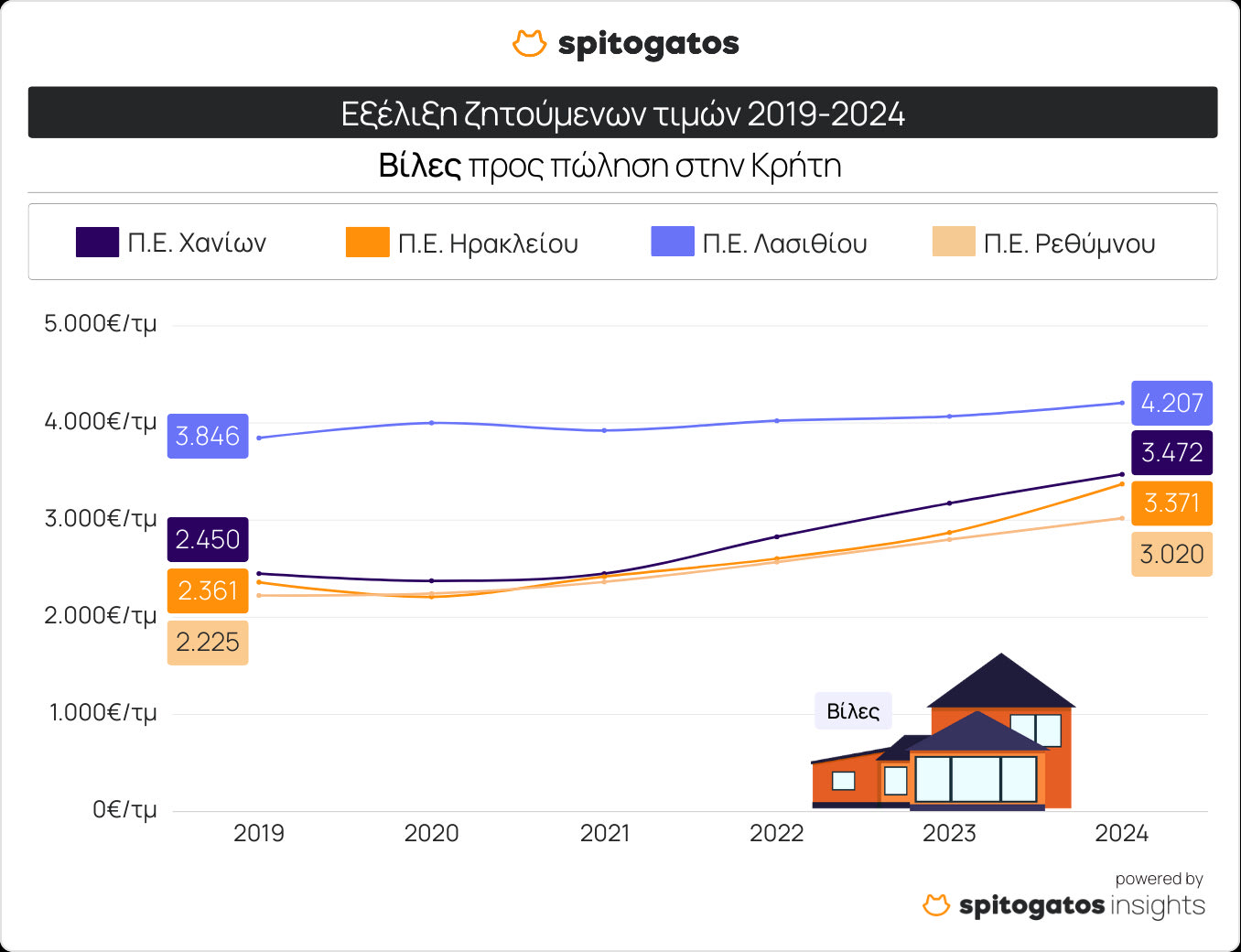 Περιοχές της Κρήτης με τις μεγαλύτερες ετήσιες αυξήσεις ζητούμενων τιμών κατοικιών το 2024