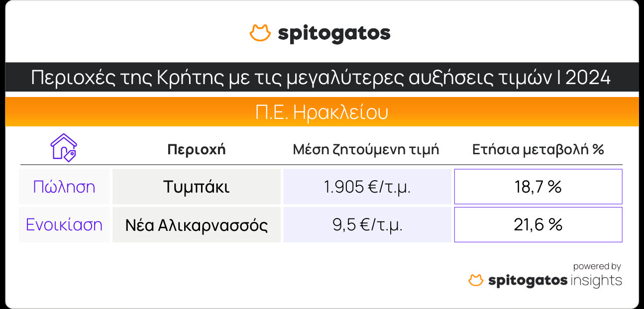 Στην Π.Ε. Ηρακλείου, η περιοχή του Τυμπακίου κατέγραψε τη μεγαλύτερη άνοδο στη μέση ζητούμενη τιμή πώλησης κατοικίας, με την ετήσια μεταβολή να φτάνει το 18,7%. Παράλληλα, η πιο μεγάλη αύξηση στη μέση ζητούμενη τιμή ενοικίασης καταγράφηκε στη Νέα Αλικαρνασσό, όπου άγγιξε το 21,6%.