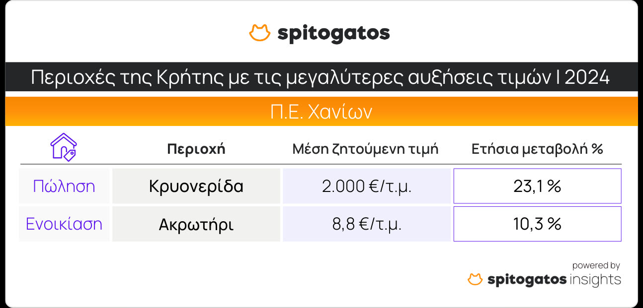 Στην Π.Ε. Χανίων, η μεγαλύτερη αύξηση στη μέση ζητούμενη τιμή πώλησης κατοικιών καταγράφηκε στην Κρυονερίδα, αγγίζοντας το 23,1%. Όσον αφορά την ενοικίαση, η υψηλότερη αύξηση σημειώθηκε στην περιοχή Ακρωτήρι, με τη μέση ζητούμενη τιμή να ενισχύεται κατά 10,3%.