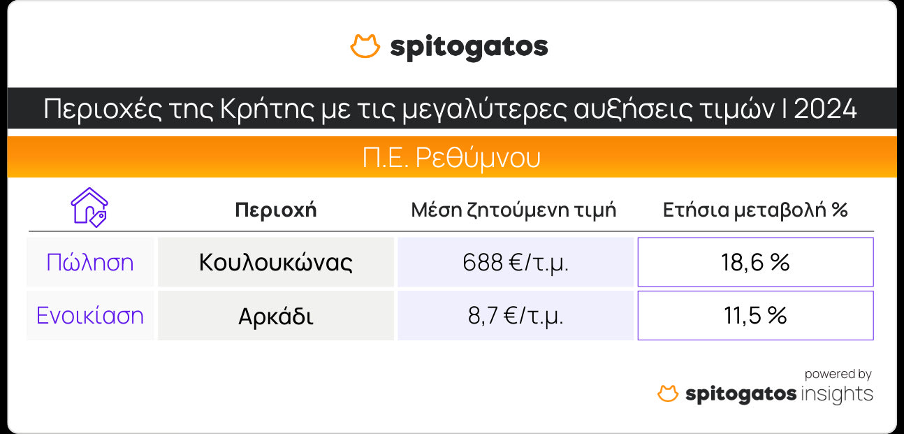 Στην Π.Ε. Ρεθύμνου, η περιοχή του Κουλουκώνα σημείωσε τη μεγαλύτερη αύξηση στη μέση ζητούμενη τιμή πώλησης κατοικίας το 2024, με ποσοστό 18,6%, ενώ η περιοχή Αρκάδι παρουσίασε τη σημαντικότερη άνοδο στη μέση ζητούμενη τιμή ενοικίασης (11,5%).