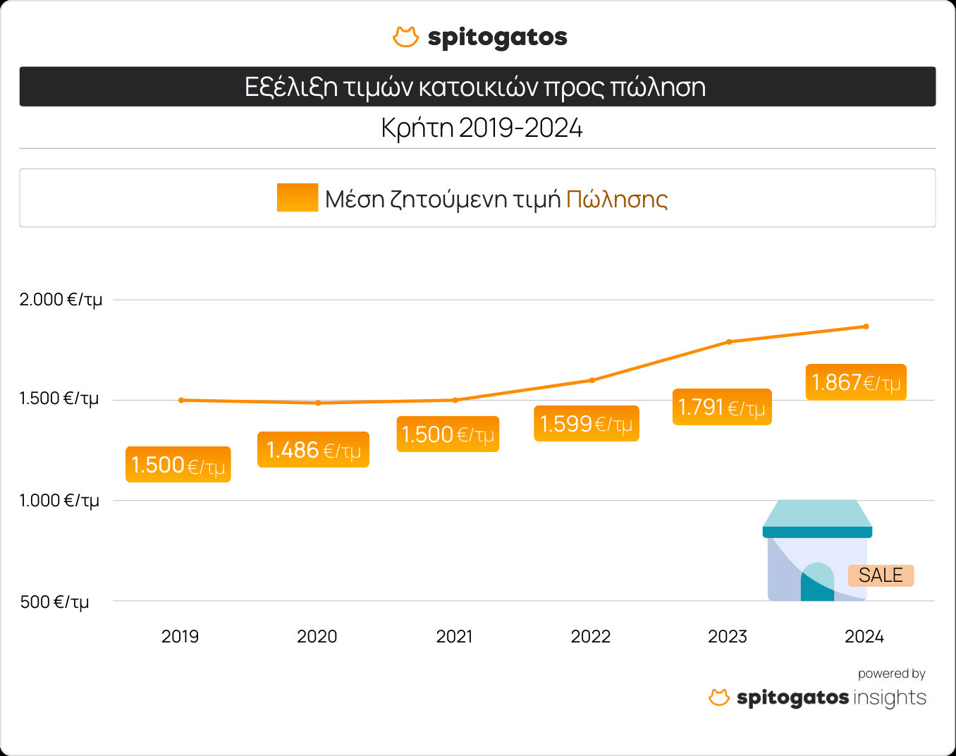 Η ανάλυση της αγοράς ακινήτων στην Κρήτη επιβεβαιώνει τη συνεχή ανοδική πορεία των μέσων ζητούμενων τιμών, τόσο για αγορά όσο και για ενοικίαση κατοικίας. Συγκεκριμένα, η μέση ζητούμενη τιμή κατοικιών προς πώληση έχει σημειώσει σταθερή άνοδο από το 2021, φτάνοντας τα 1.867€/τ.μ. το 2024.