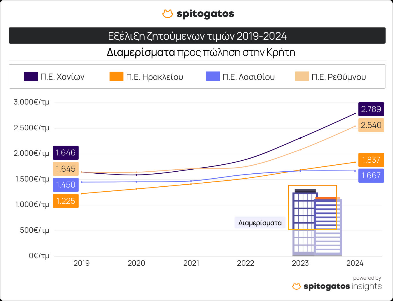 Η Π.Ε. Χανίων διατηρεί την «πρωτιά» στις υψηλότερες τιμές πώλησης διαμερισμάτων το 2024 με τη μέση ζητούμενη τιμή πώλησης να ανέρχεται στις 2.789€/τ.μ. Την ίδια ώρα, εντυπωσιακή είναι η άνοδος της μέσης ζητούμενης τιμής πώλησης διαμερισμάτων από το 2019 μέχρι και το 2024 με ποσοστό 69,4%, όπως φαίνεται και στο παρακάτω γράφημα.