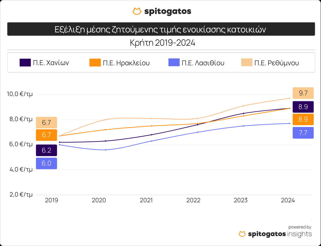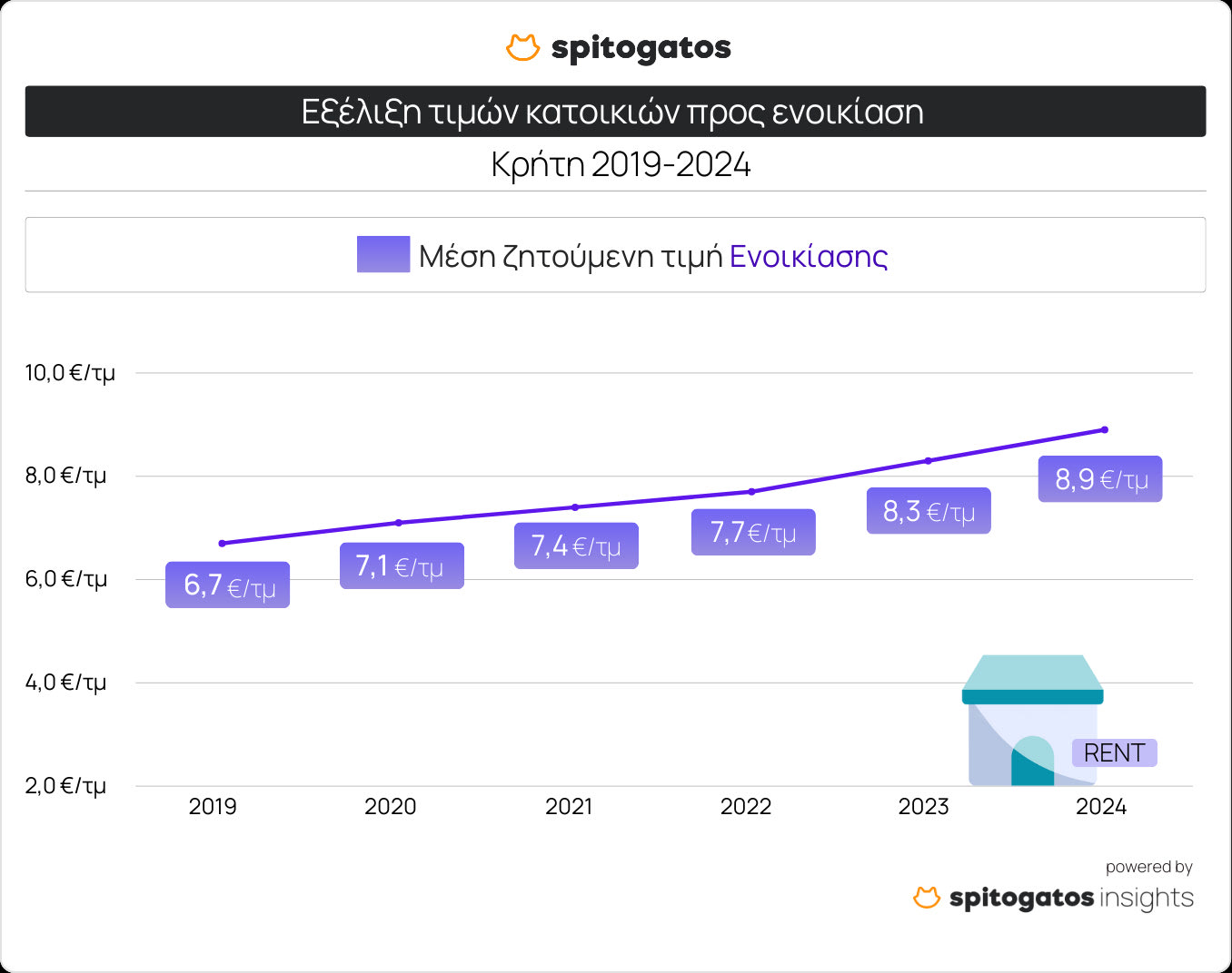 Παράλληλα, η μέση ζητούμενη τιμή ενοικίασης κατοικίας την περίοδο 2019-2024 παρουσίασε επίσης ανοδική πορεία, σημειώνοντας αύξηση 33,7%, υπογραμμίζοντας τη διαρκώς αυξανόμενη ζήτηση για στέγαση στο νησί.