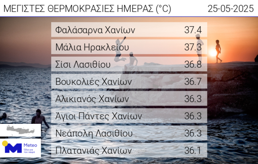 Το πρωί της Κυριακής 25/05 οι συγκεντρώσεις σκόνης έχουν υποχωρήσει σημαντικά, αλλά επιμένουν οι υψηλές θερμοκρασίες. Οι 8 υψηλότερες θερμοκρασίες στο νησί στις 9 το πρωί της Κυριακής 25/05 παρατίθενται στον πίνακα που ακολουθεί: