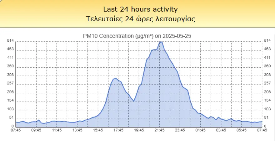 Σημειώνεται ότι και στους 2 σταθμούς, οι συγκεντρώσεις σωματιδίων ξεπέρασαν τα 100 μικρογραμμάρια ανά κυβικό μέτρο για σχεδόν 9 συνεχόμενες ώρες (1630 απόγευμα Σαββάτου μέχρι 0115 πρωί Κυριακής).