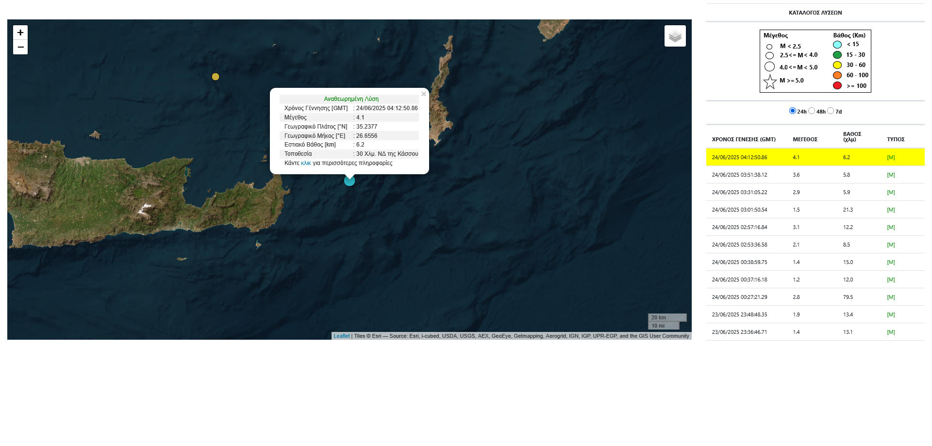 Σύμφωνα με το Γεωδυναμικό Ινστιτούτο του Εθνικού Αστεροσκοπείου Αθηνών, το επίκεντρο της δόνησης εντοπίζεται στον θαλάσσιο χώρο 30 χλμ. δυτικά-νοτιοδυτικά της Κάσου, ενώ το εστιακό βάθος του σεισμού ήταν 6,2 χλμ.