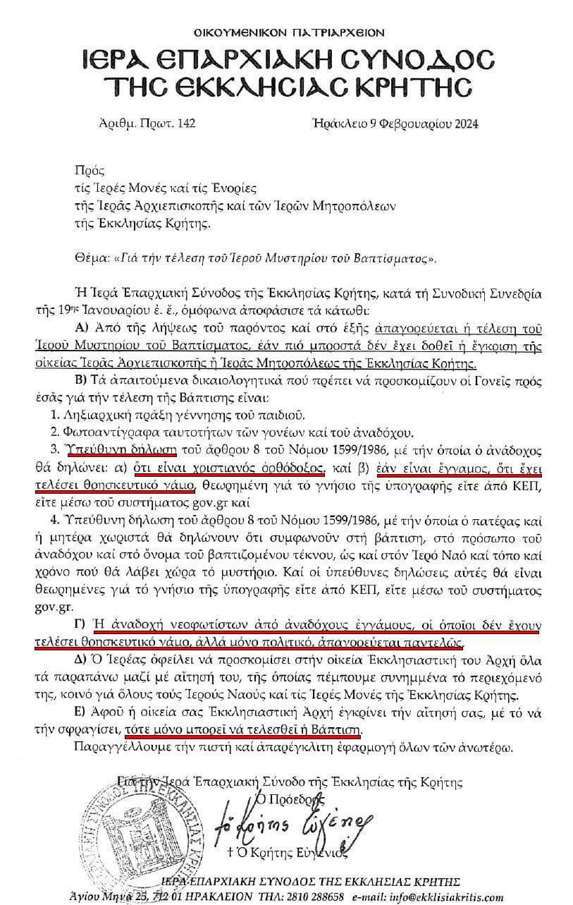 Σύμφωνα με την εγκύκλιο- που αποκάλυψε ο Δημ.Αλικάκος- και απεστάλη χθες προς τις Ενορίες και τις ιερές Μονές του νησιού, από την Ιερά Επαρχιακή Σύνοδο της Εκκλησίας της Κρήτης, ΑΠΑΓΟΡΕΥΕΤΑΙ η τέλεση του μυστηρίου της Βάπτισης άνευ της έγκρισης από την οικεία Μητρόπολη.