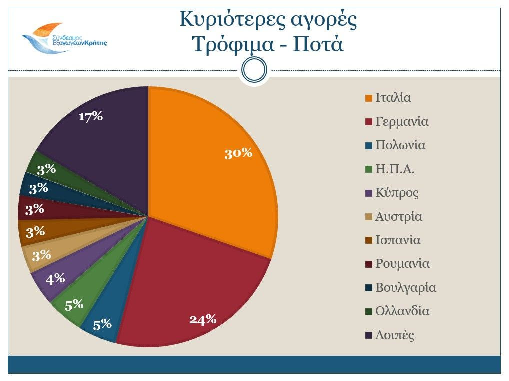 Σχετικά με τις αγορές, οι κυριότεροι αγοραστές των Κρητικών προϊόντων είναι η Ιταλία (104,4 εκ. ευρώ και μερίδιο 19,4%), η Γερμανία (96,6 εκ. ευρώ και μερίδιο 17,9%), η Γαλλία (34,6 εκ. ευρώ, μερίδιο 6,4%), η Ολλανδία (26,2 εκ. ευρώ, μερίδιο 4,9%) και οι Η.Π.Α. (25,1 εκ. ευρώ και μερίδιο 4,7%). Τη δεκάδα των κυριότερων αγοραστών κλείνουν η Πολωνία, η Κύπρος, η Ισπανία, η Ρουμανία και η Βουλγαρία.