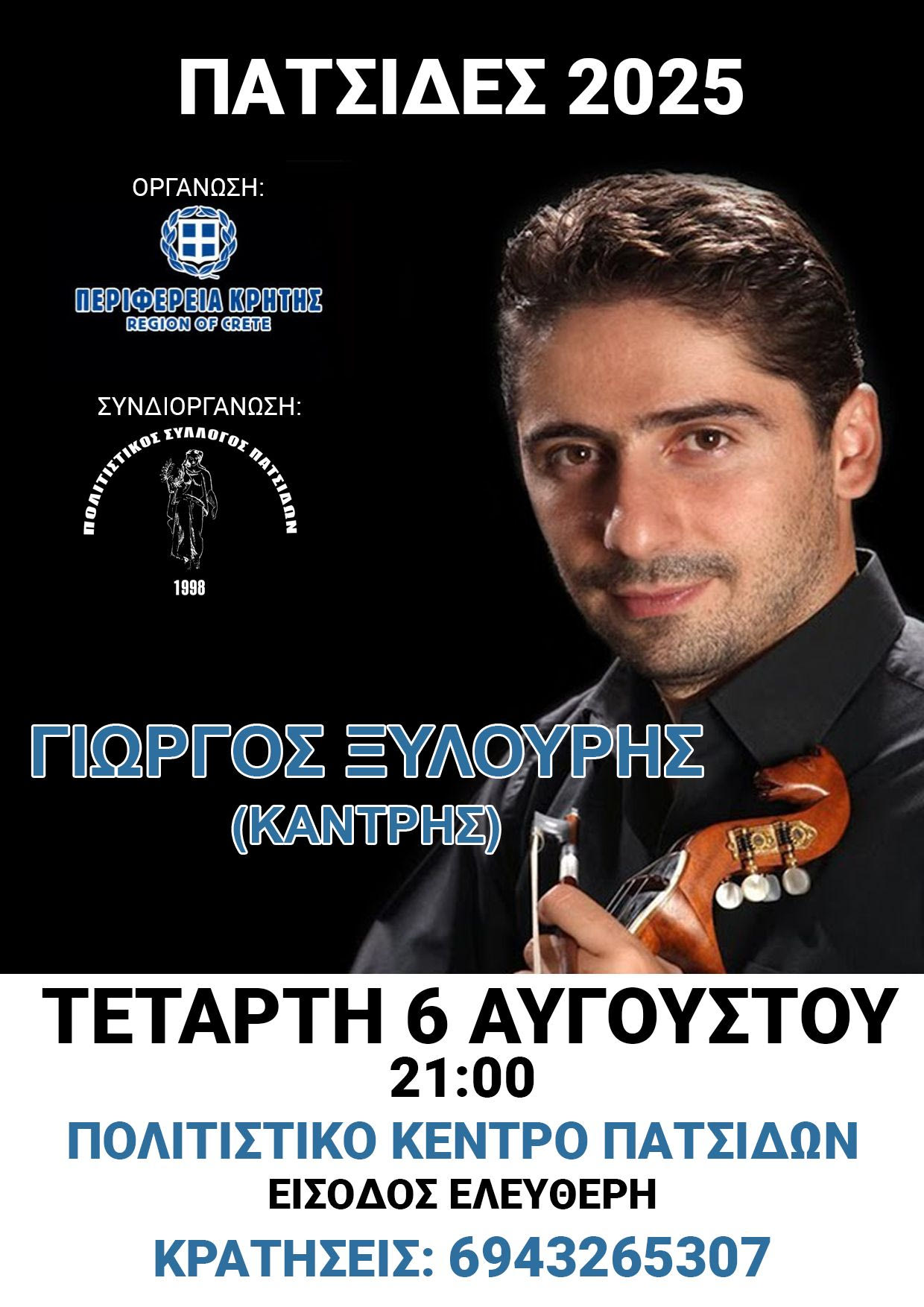 Πολιτιστικός Σύλλογος Πατσίδων και η Περιφέρεια Κρήτης σας προσκαλούν την Τετάρτη 6 Αυγούστου και ώρα 21.30 στο Πολιτιστικό Κέντρο Πατσίδων να απολαύσουμε μία γνήσια Κρητική βραδιά κάτω από το φως του αυγουστιάτικου φεγγαριού με το συγκρότημα του Γιώργη Ξυλούρη Καντρή.