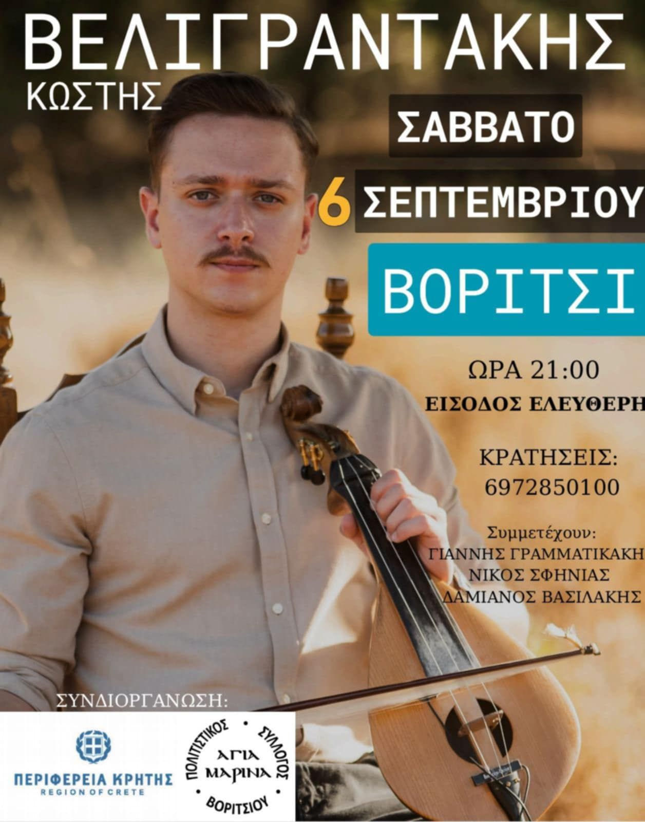 Ένα αυθεντικό κρητικό γλέντι θα πραγματοποιηθεί το Σάββατο 6 Σεπτεμβρίου 2025 στο Βορίτσι, με τον Κωστή Βελιγραντάκη να μας παρασύρει στους ρυθμούς της κρητικής μουσικής. Με τη λύρα του και τις δικές του συνθέσεις, θα προσφέρει μια μοναδική βραδιά γεμάτη παραδοσιακή μουσική και κρητική ταυτότητα.