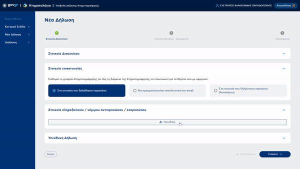 2. Συμπλήρωση προσωπικών στοιχείων και στοιχείων εκπροσώπων Στο επόμενο βήμα συμπληρώστε τα προσωπικά σας στοιχεία, δηλώστε αν το επιθυμείτε πληρεξούσιο, και αποδεχθείτε την υπεύθυνη δήλωση για τη δήλωση σας.