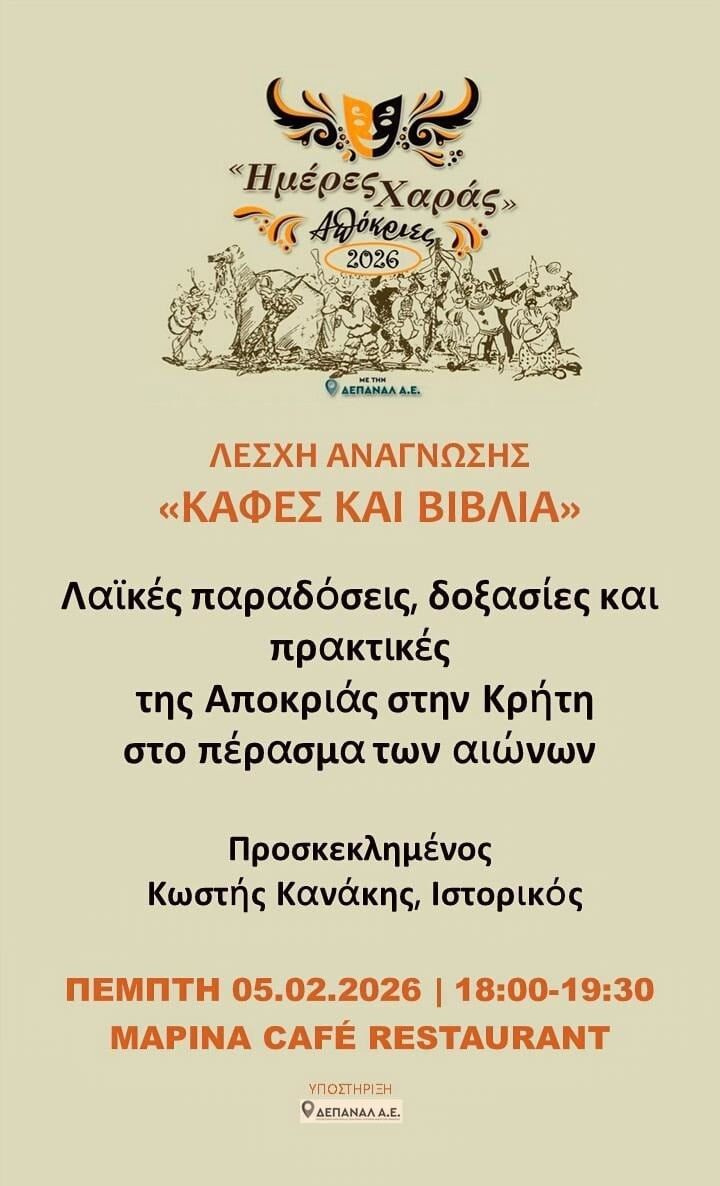 Το θέμα της ημέρας – προσαρμοσμένο στις ημέρες της Αποκριάς – θα είναι «Λαϊκές παραδόσεις, δοξασίες και πρακτικές της Αποκριάς στην Κρήτη, στο πέρασμα των αιώνων» με προσκεκλημένο τον ιστορικό και πολιτισμολόγος Κωστή Κανάκη. Η συζήτηση θα εστιάσει στις αποκριάτικες πρακτικές της Κρήτης, αναδεικνύοντας τις ιστορικές τους ρίζες, τις λαϊκές δοξασίες και τη συμβολική τους σημασία, μέσα από μια διαχρονική και πολιτισμική προσέγγιση με την ανάγνωση σχετικών ιστορικών πηγών και κειμένων.