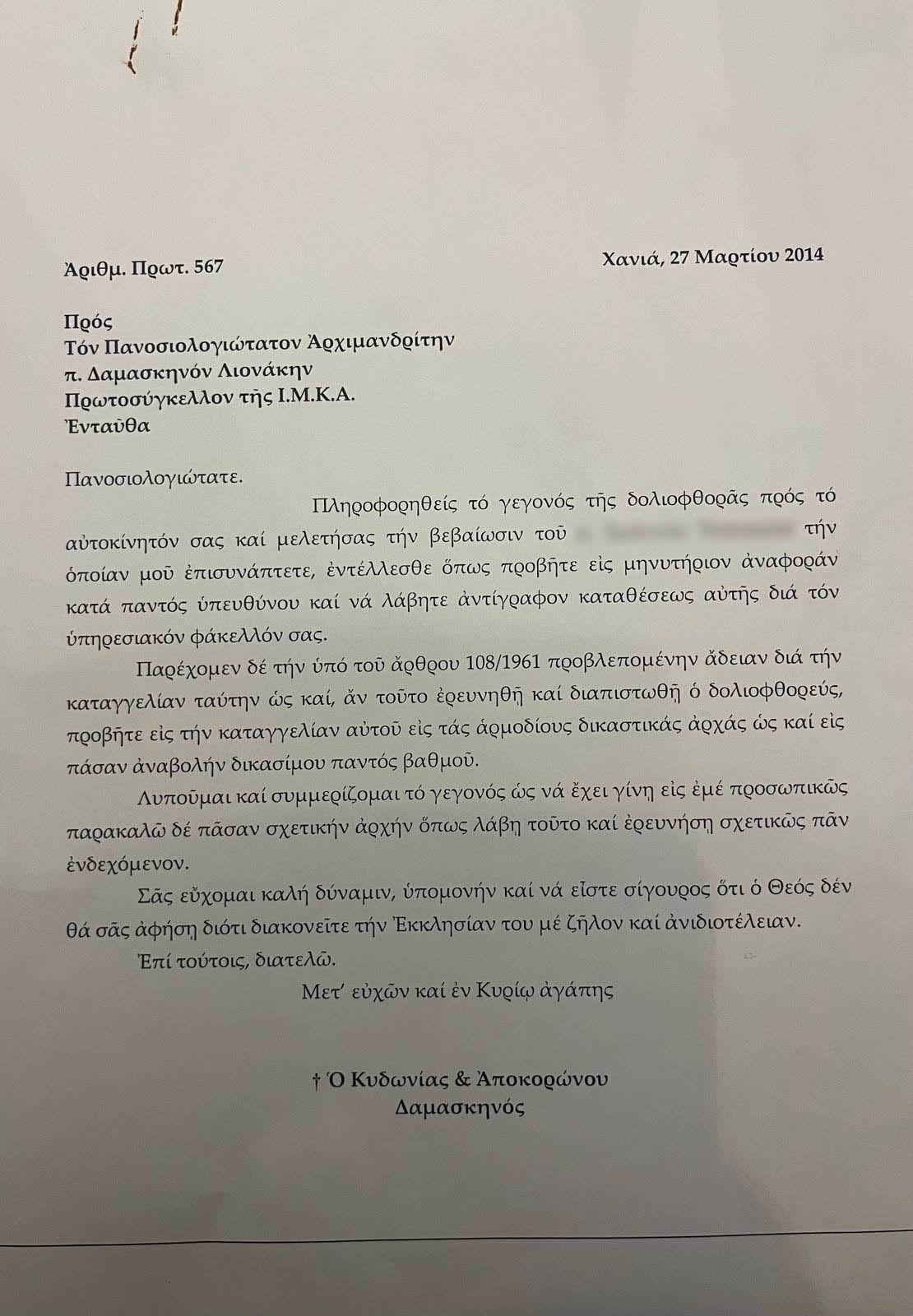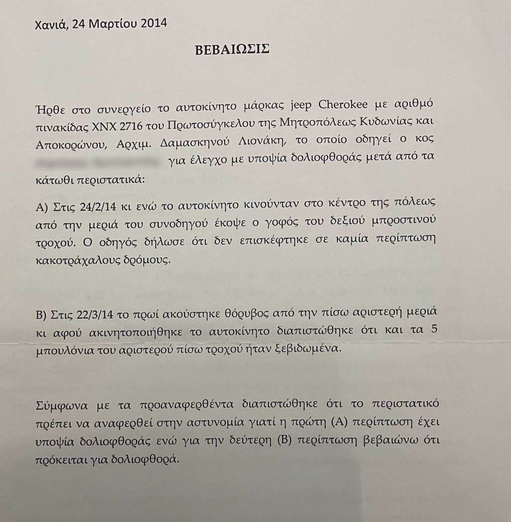 Είναι επίσης χαρακτηριστικό, σύμφωνα με τις ίδιες πηγές ότι, της καρατόμησης του ηγουμένου από το Ιστορικό Μοναστήρι, προηγήθηκαν το 2014 απειλές και δολιοφθορές στο αυτοκίνητο του καθώς τότε ήταν Πρωτοσύγκελος στην Μητρόπολη και χειριζόταν σοβαρές υποθέσεις της Μητρόπολης και περιουσιακά-οικονομικά ζητήματα. Μάλιστα τότε υπήρξε -όπως αποδεικνύεται εγγράφως ,η άδεια του Μητροπολίτη να καταφύγει ο Αρχιμανδρίτης στην Αστυνομία ενώ υπήρξε και πραγματογνωμοσύνη εμπειρογνώμονα για τις ζημιές που είχαν προκληθεί στο όχημα του από τους άγνωστους τότε δράστες που δεν αποκλείεται να είναι οι ίδιοι.