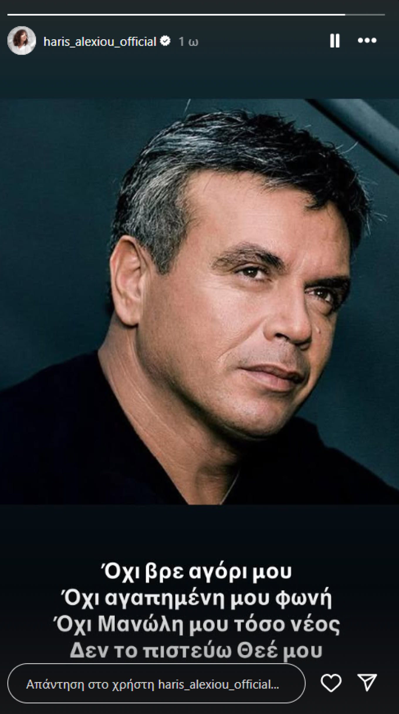 Ανάμεσα σε εκείνους που έγραψαν για τον θάνατο του Μανώλη Λιδάκη, ήταν και η Χάρις Αλεξίου, η οποία αδυνατεί να πιστέψει την απώλειά του. Συγκεκριμένα η Χάρις Αλεξίου δημοσίευσε σε story στο Instagram, μια φωτογραφία του τραγουδιστή, γράφοντας τα παρακάτω λόγια: «Όχι βρε αγόρι μου. Όχι αγαπημένη μου φωνή. Όχι Μανώλη μου τόσο νέος. Δεν το πιστεύω Θεέ μου».