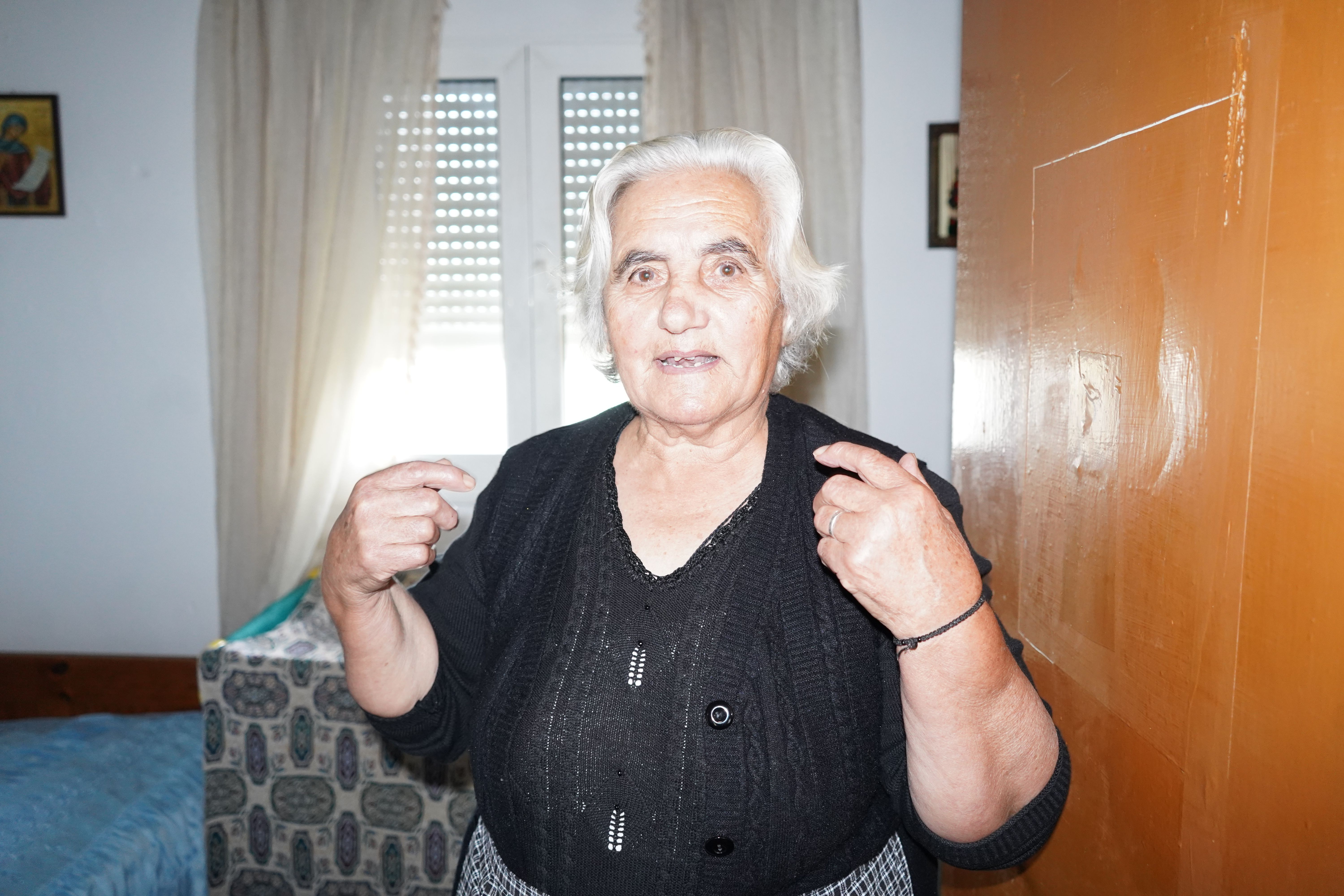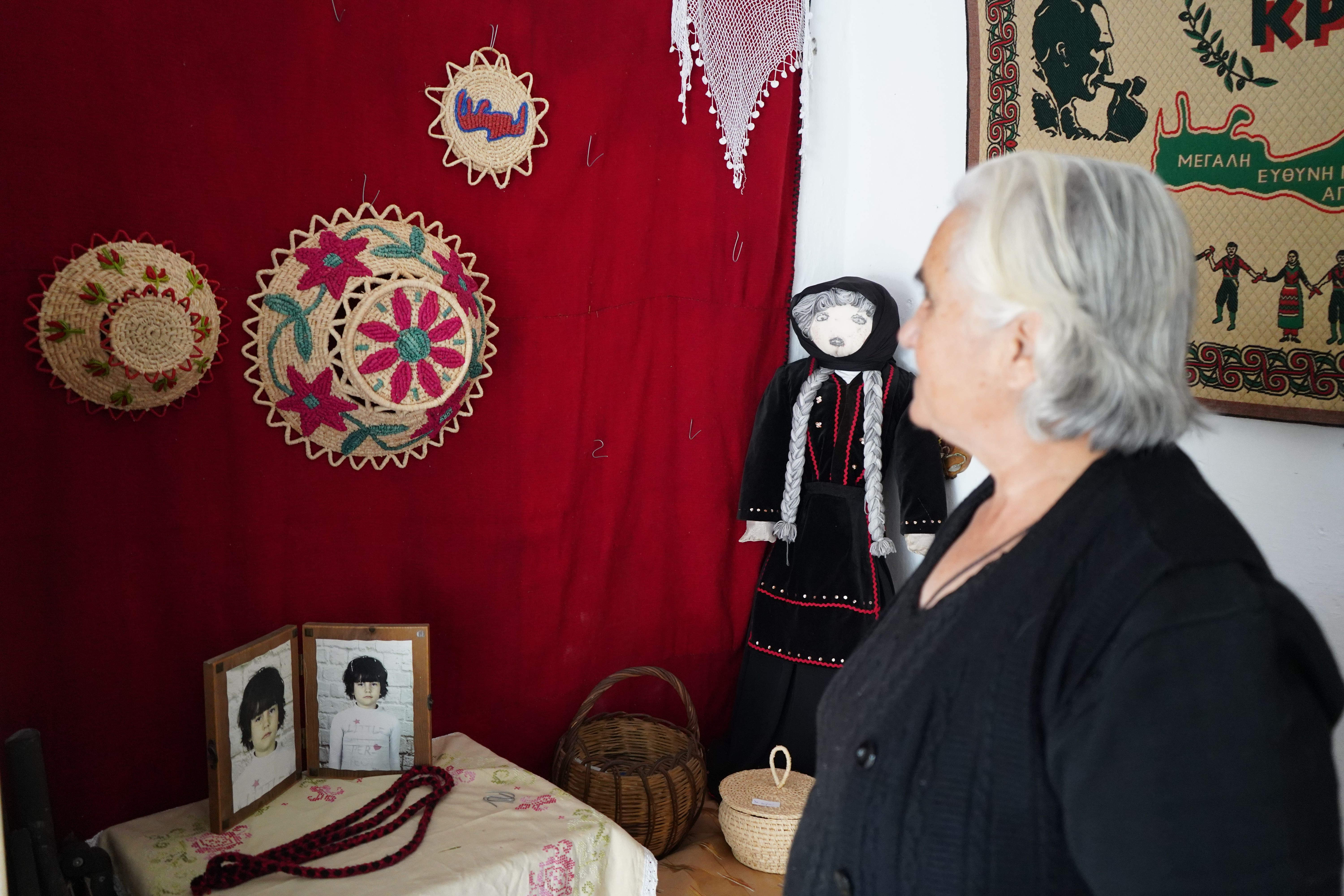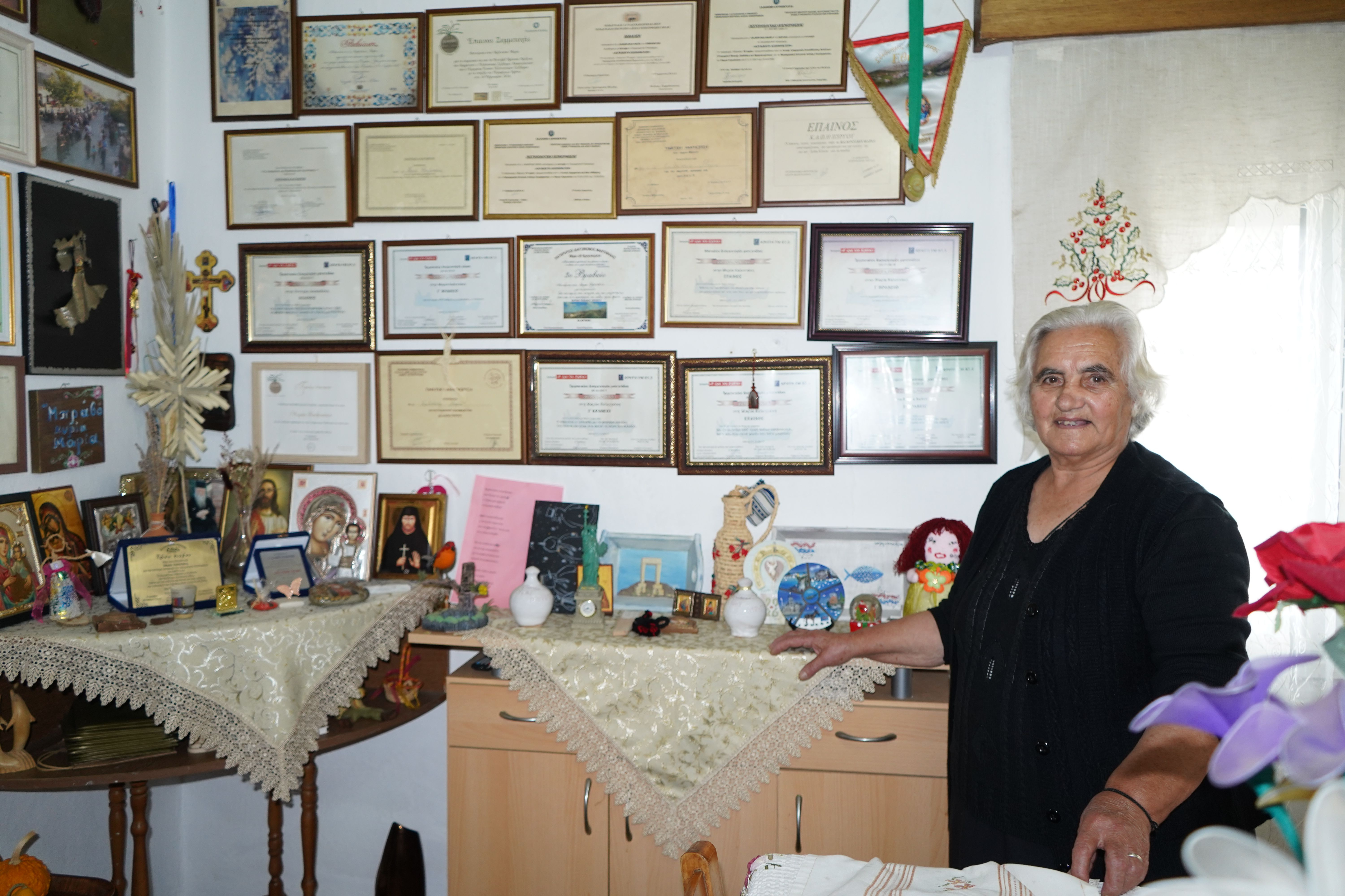 Μπαίνοντας στο σπίτι της, οι τοίχοι σού αφηγούνται ιστορίες. Κάδρα με τιμητικές διακρίσεις και επαίνους, εικόνες και σταυροί, οικογενειακές φωτογραφίες, χειροποίητα εργόχειρα και μικρά αντικείμενα που δεν βρίσκονται εκεί για διακόσμηση, αλλά ως σημάδια πορείας.