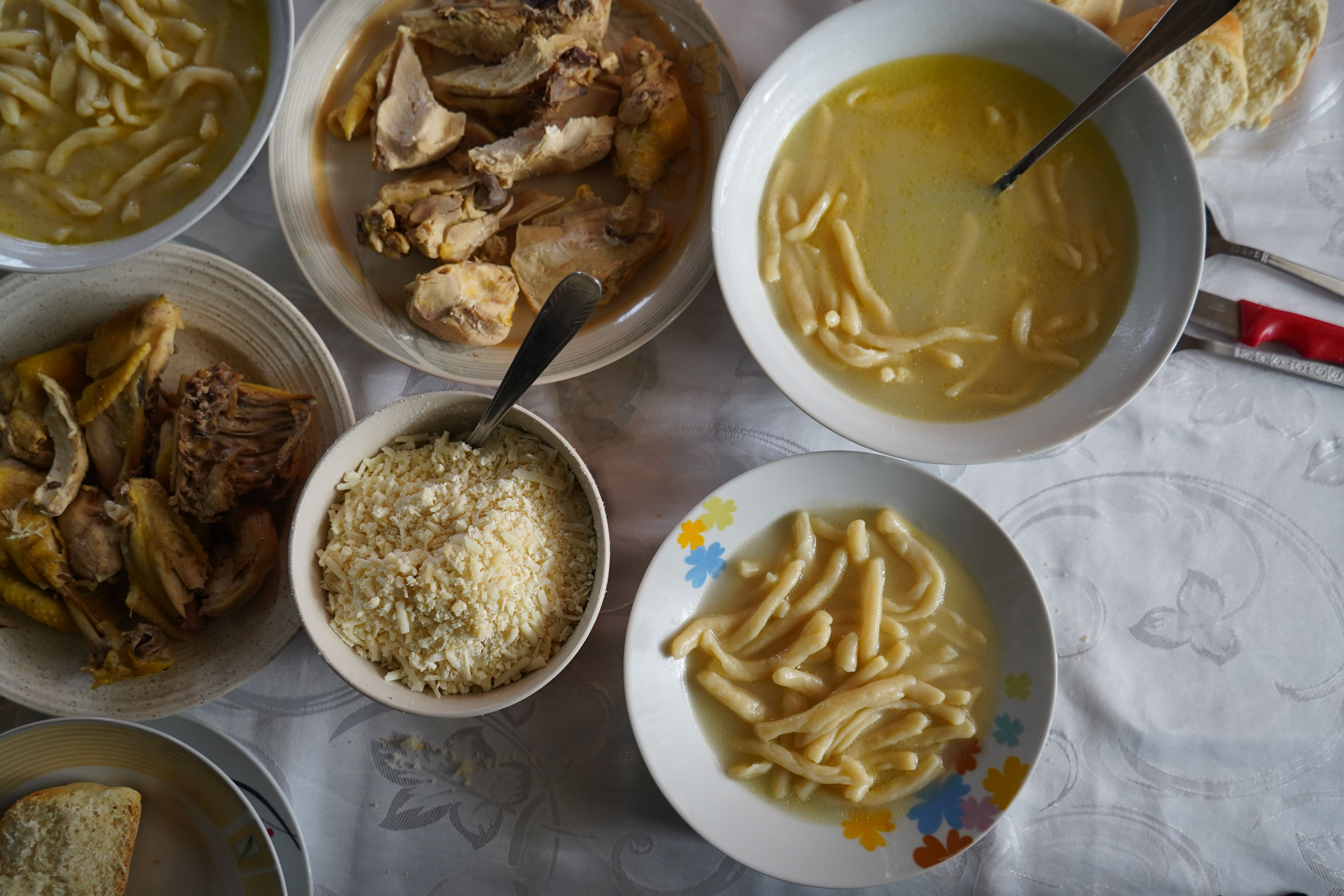 Στο τραπέζι, που στρώνει για τους επισκέπτες της, κυριαρχούν το βραστό χωριάτικο κοτόπουλο, τα χειροποίητα μακαρόνια, το ζυμωτό ψωμί, το ψητό κατσικάκι με τις πατάτες στον ξυλόφουρνο.