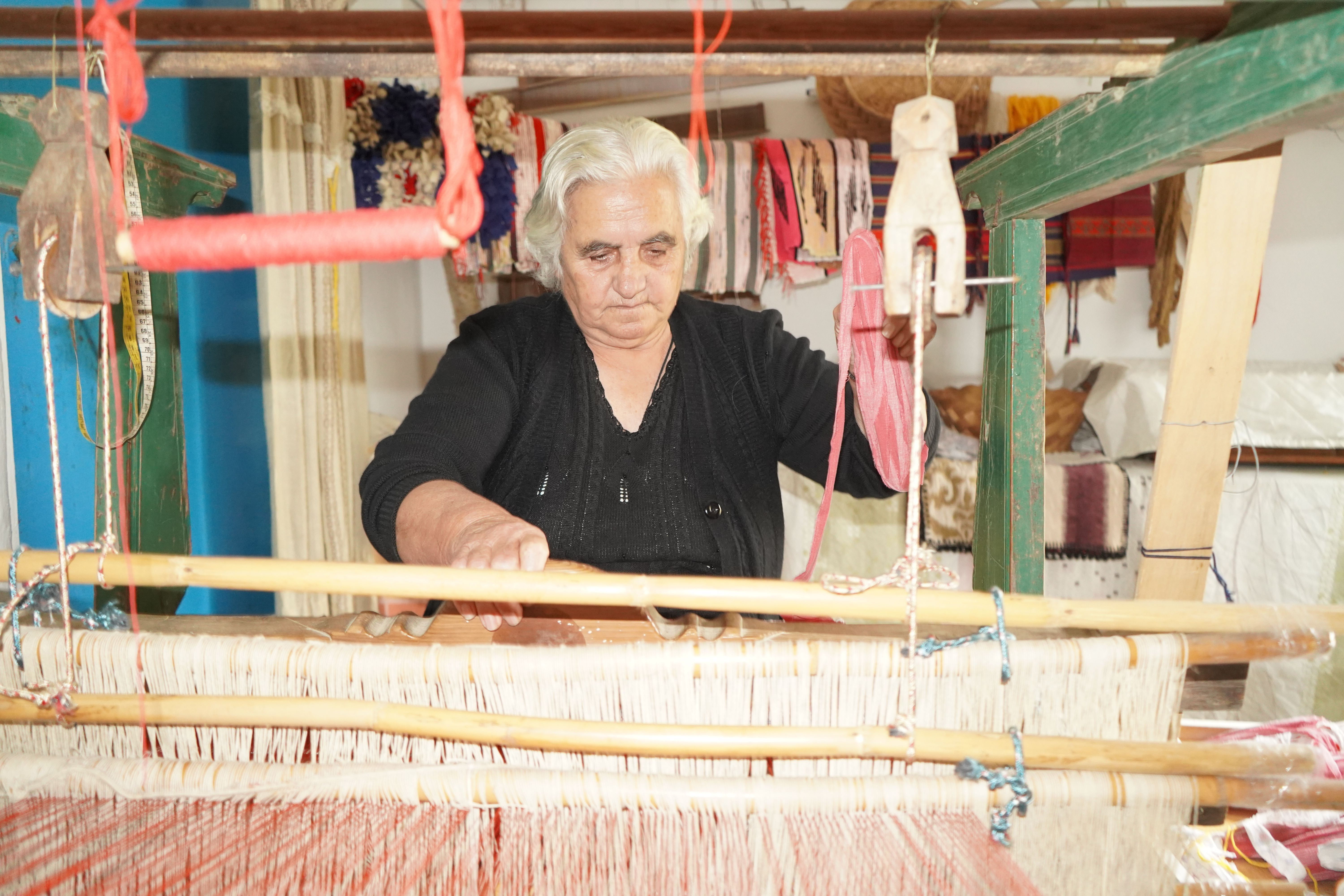 Στον χώρο του αργαλειού, η Μαρία στέκεται σκυμμένη, με βλέμμα συγκεντρωμένο. Τα νήματα τεντωμένα, τα χρώματα μετρημένα, οι κινήσεις σταθερές. Δεν υπάρχει βιασύνη. Ο αργαλειός απαιτεί ρυθμό, υπομονή και γνώση -και εκείνη τα έχει όλα. Τα υφαντά της κρέμονται στους τοίχους σαν ζωντανά δείγματα μιας τέχνης, που δεν έμεινε στο παρελθόν, αλλά συνεχίζει να αναπνέει.
