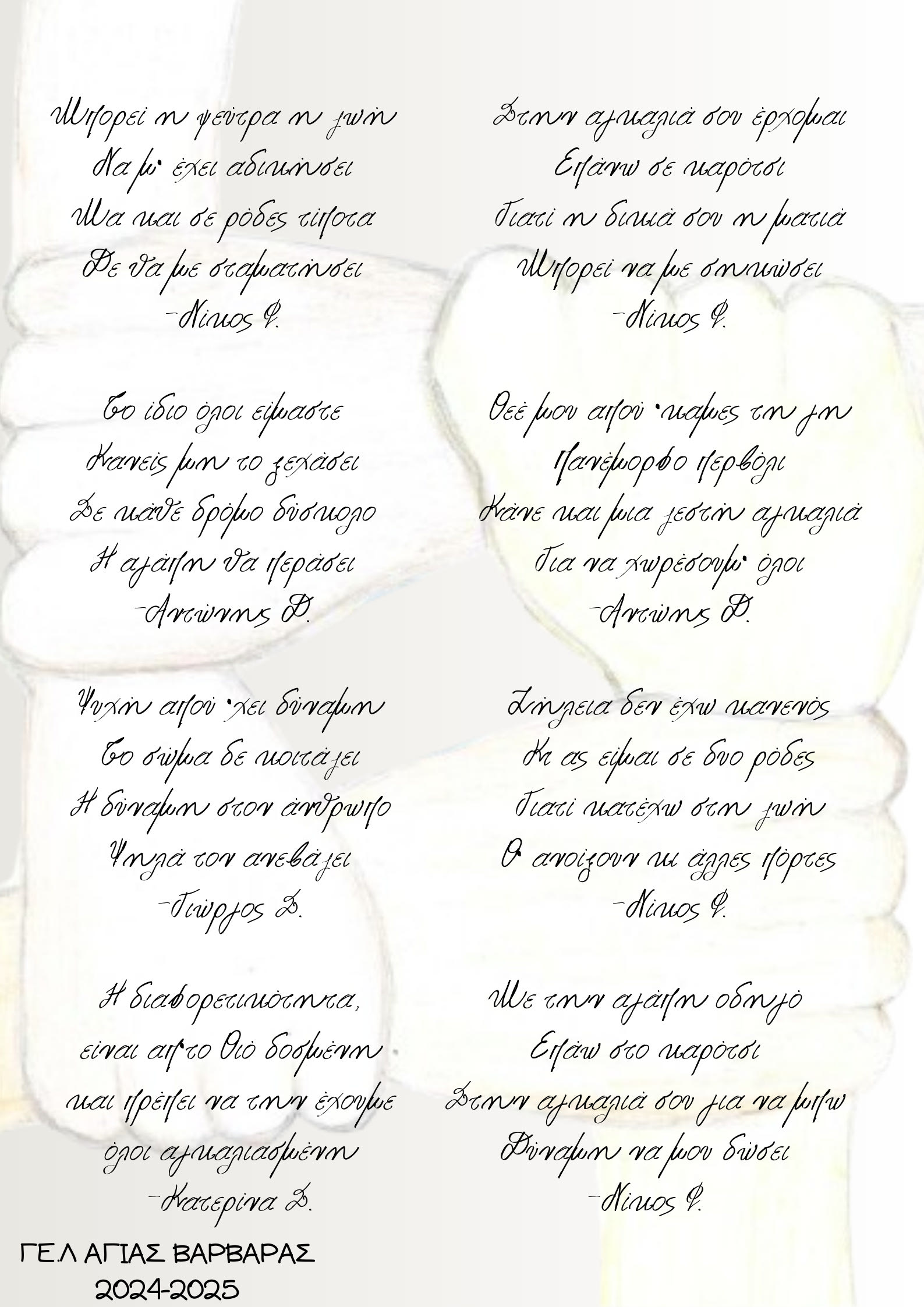 Συμμετείχαν στην Πανελλήνια διαδικτυακή δράση ¨Αυτό που μας ενώνει 2024-25¨ που διοργανώνει το ΕΕΕΕΚ Ξάνθης στα πλαίσια της Παγκόσμιας Ημέρας Ατόμων με Αναπηρία. Παράλληλα, οι μαντινάδες στάλθηκαν στην Περιφερειακή Ένωση Τυφλών Κρήτης, οι οποίοι βοήθησαν, ούτως ώστε να μεταφραστούν στη γραφή braille.
