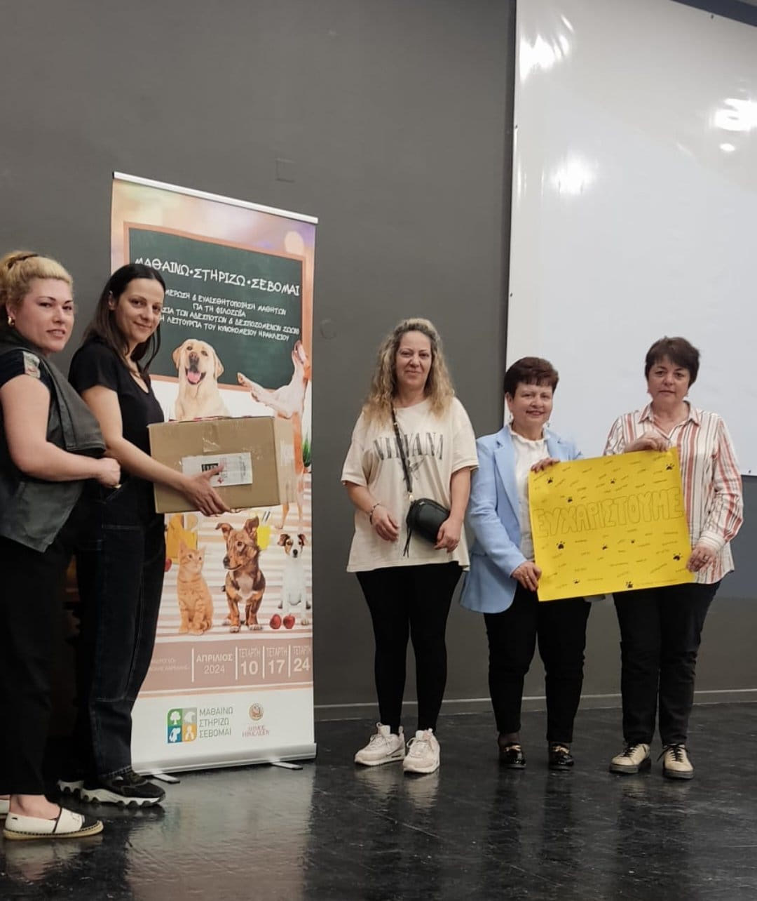 Το υλικό παραδόθηκε  στην αίθουσα «Μανόλης Καρέλλης» στο κτίριο Ανδρόγεω, όπου έγινε παράλληλα και παρουσίαση στους μαθητές για τη φιλοζωία και το Κυνοκομείο Ηρακλείου, παρουσία των Αντιδημάρχων αλλά και της Εύης Μαρτιμιανάκη.