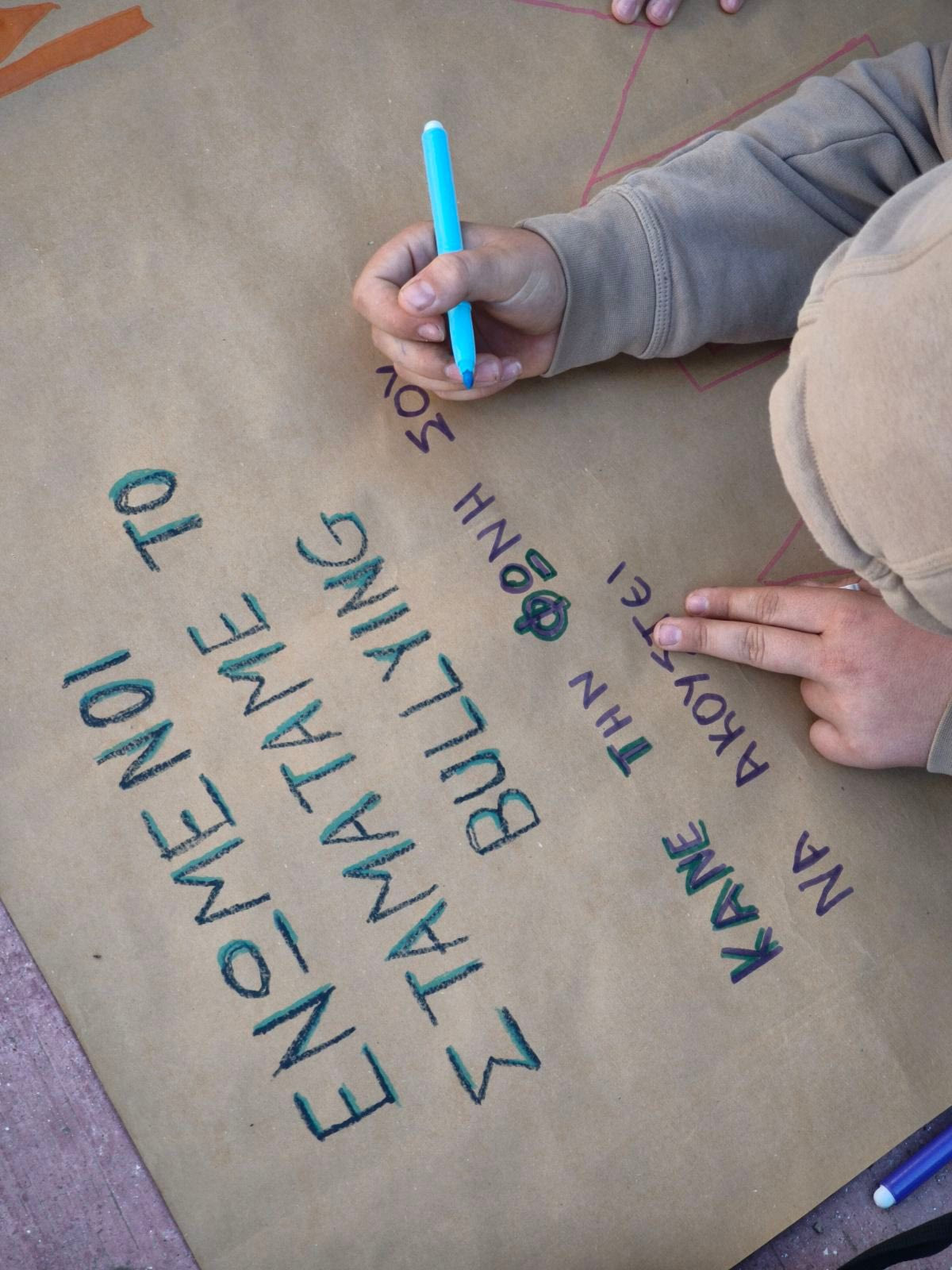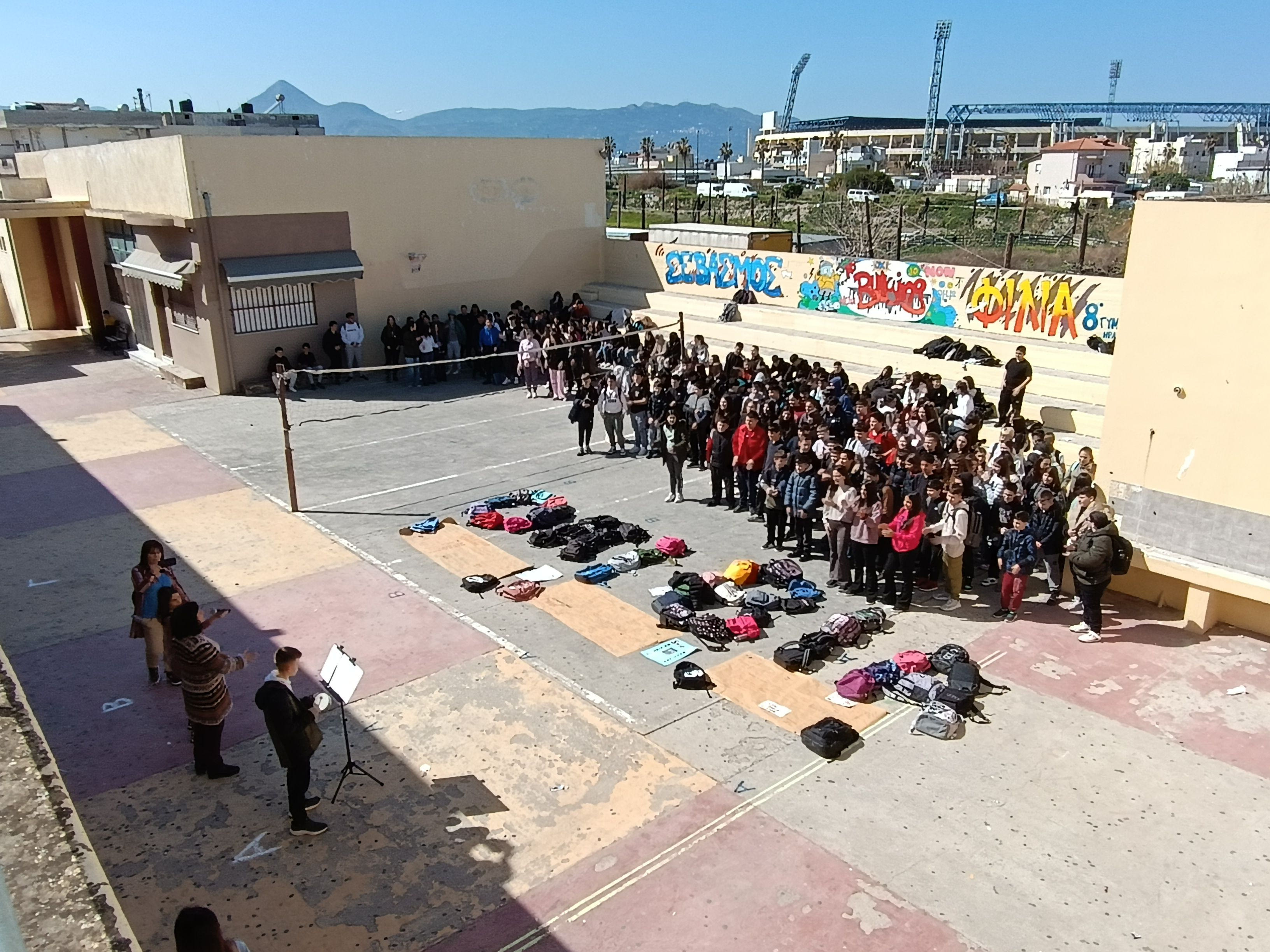 Κατόπιν όλα τα παιδιά βγήκαν στην αυλή και είτε ζωγράφισαν συνθήματα και εικόνες κατά του bullying σε χαρτόνια ανά τάξη, είτε έγραψαν με τις τσάντες τους το σύνθημα “ΟΧΙ ΒΙΑ”.