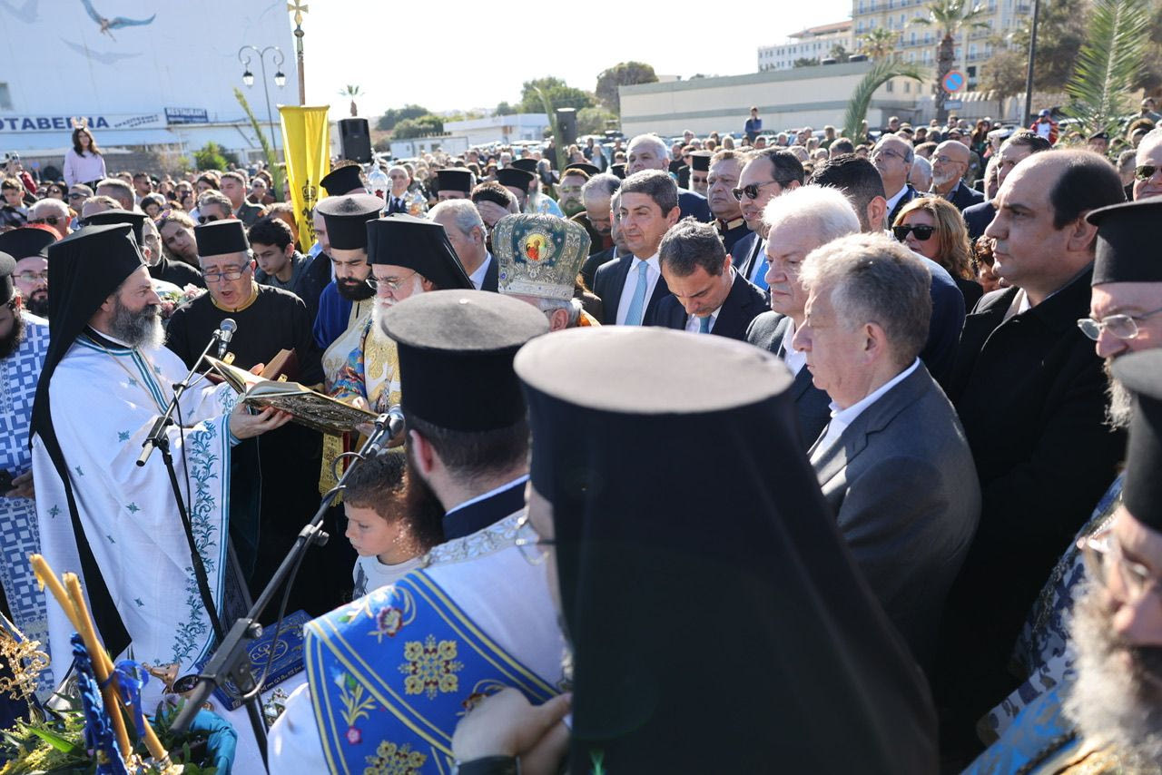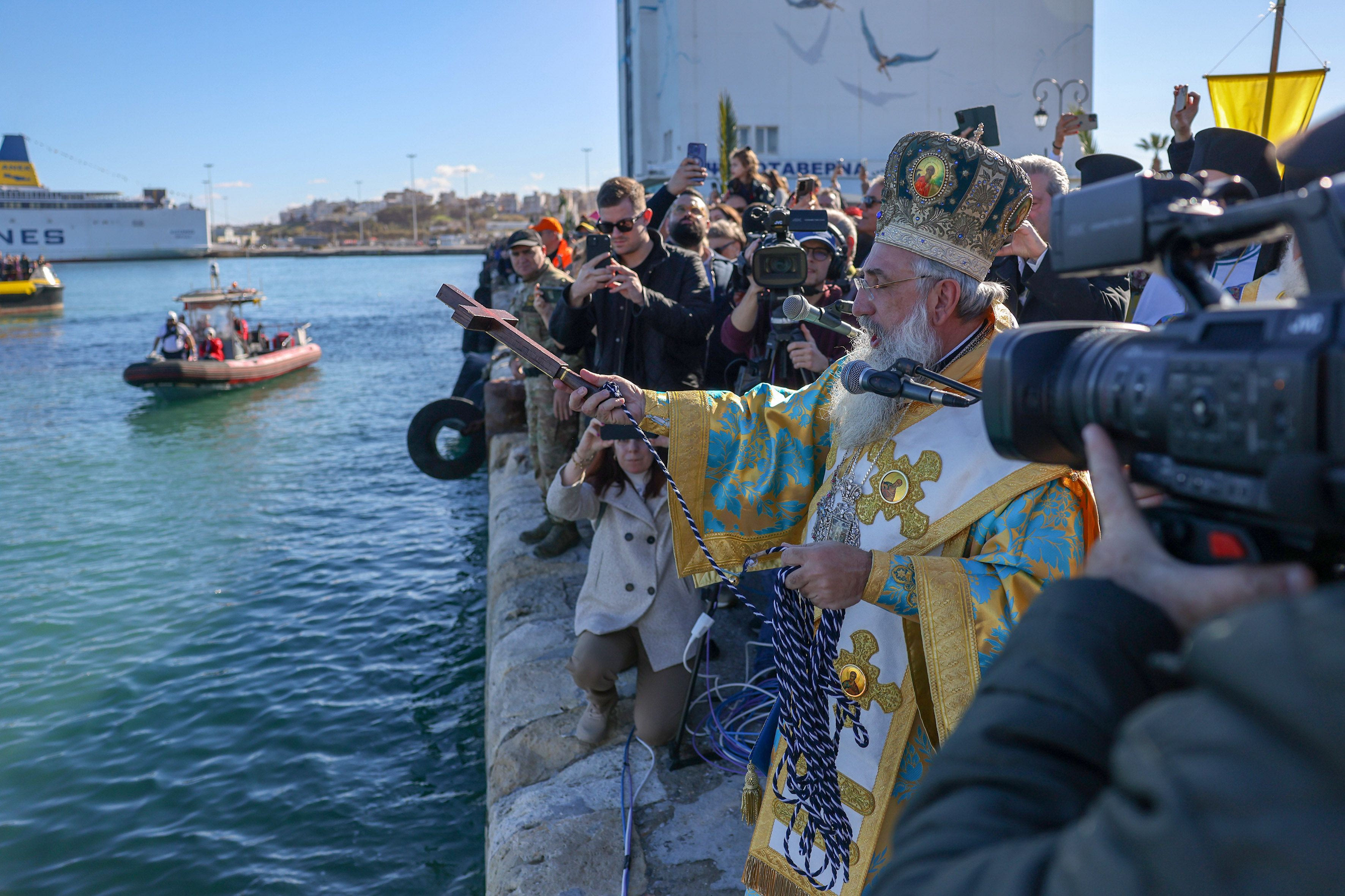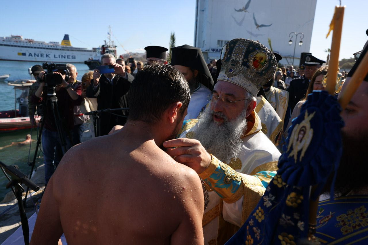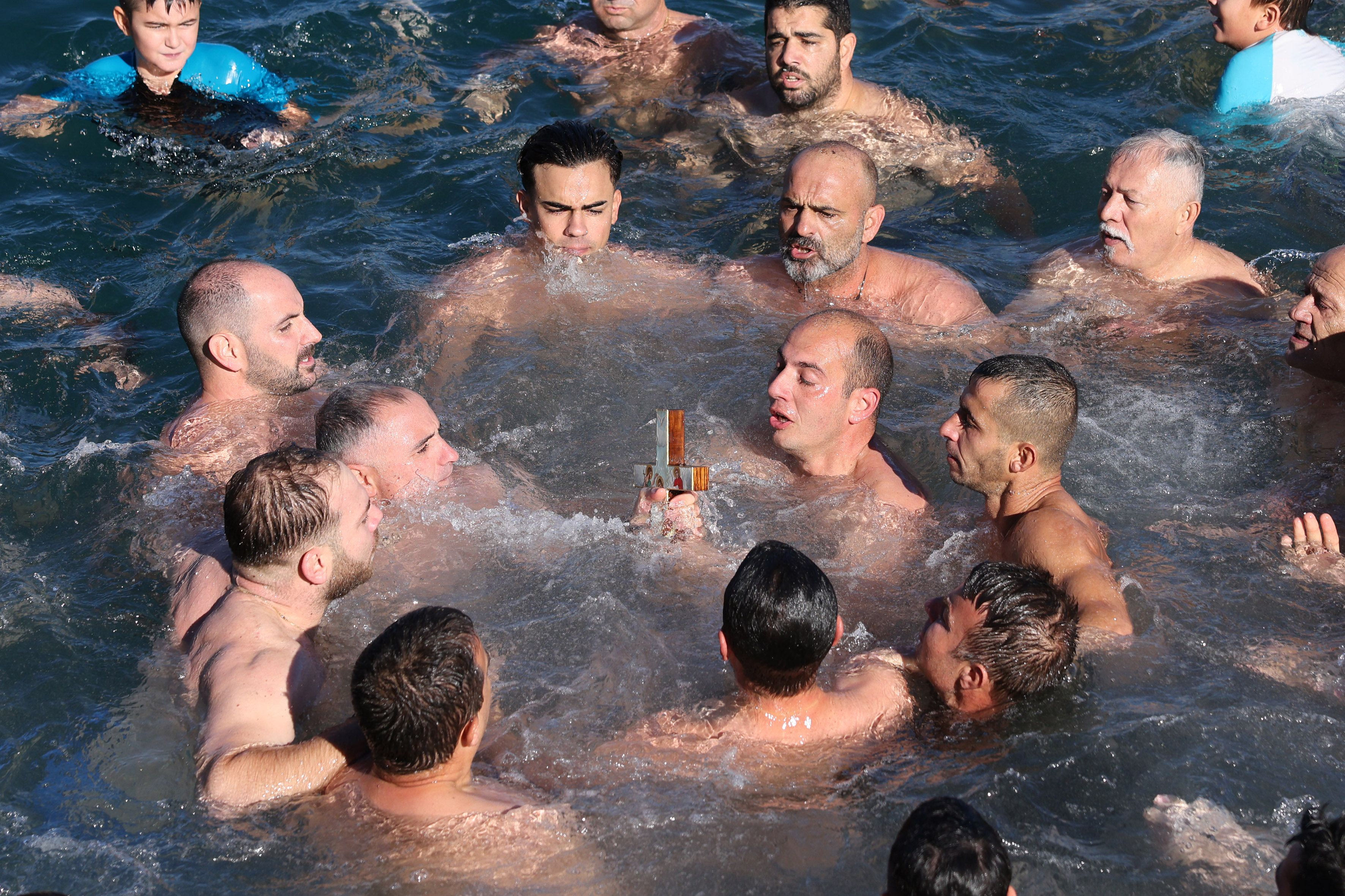 Περισσότεροι από πενήντα «βουτηχτάδες» έπεσαν στα νερά του λιμανιού, για να πιάσουν τον σταυρό, με τους φορείς και τους πιστούς που παραβρέθηκαν στο λιμάνι, να χειροκροτούν θερμά.