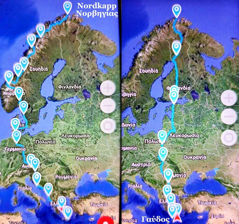 Όπως αναφέρει το anatolh.com, ξεκίνησαν, με τις μοτοσικλέτες τους, από τον Άγιο Νικόλαο και έφτασαν ως στο βορειότερο σημείο της Ευρώπης, το Nordkapp της Νορβηγίας. Από την Ελλάδα συνέχισαν σε Αλβανία, Μαυροβούνιο, Βοσνία, Κροατία, Σλοβενία, Αυστρία, Γερμανία, Δανία, Σουηδία, Νορβηγία. Στην επιστροφή, ακολουθώντας διαφορετικό δρομολόγιο, πέρασαν από Φινλανδία, Εσθονία, Λετονία, Λιθουανία, Πολωνία, Σλοβακία, Ουγγαρία, Ρουμανία, Βουλγαρία, Ελλάδα και τερμάτισαν στο νοτιότερο σημείο της Ευρώπης, στην περίφημη «καρέκλα» της Γαύδου! Ήταν ένα ταξίδι που διήρκεσε 24 ημέρες, διανύθηκαν 13.430 χιλιόμετρα, μέσα από 20 διαφορετικές χώρες της Ευρώπης.