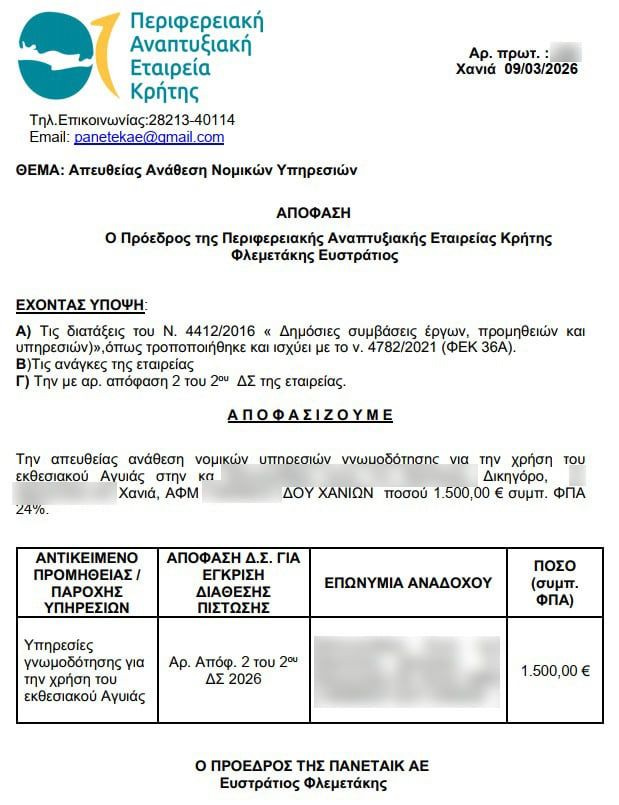 Μάλιστα, όπως φαίνεται και σε σχετική απόφαση στο «Διαύγεια», ζητήθηκε η γνωμοδότηση νομικής συμβούλου από τα Χανιά για να είναι καθ’ όλα ορθή η σύμβαση.