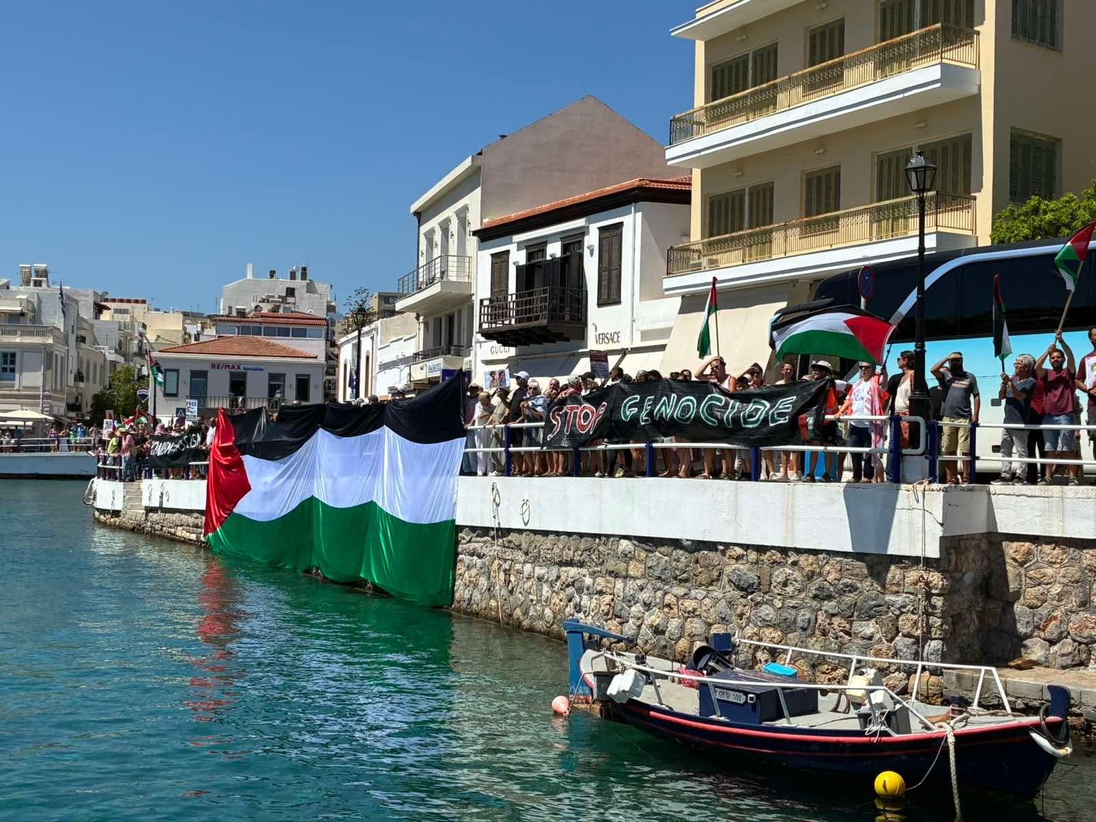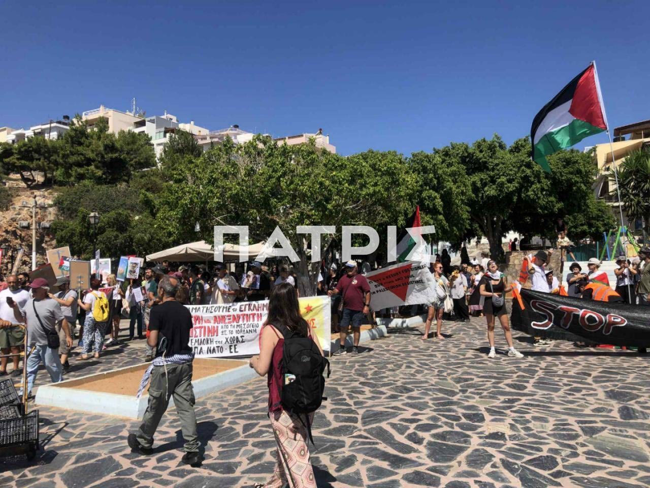 Από νωρίς το πρωί πλήθος κόσμου συγκεντρώθηκε στη λίμνη του Αγίου Νικολάου, ανταποκρινόμενο στο κάλεσμα φορέων και συλλογικοτήτων προκειμένου να εκφράσουν την αγανάκτηση τους για τα όσα φρικτά συμβαίνουν στην Παλαιστίνια. Μάλιστα ύψωσαν τεράστιες σημαίες της Παλαιστίνης φωνάζοντας συνθήματα για «Ελευθερία στην Παλαιστίνη».