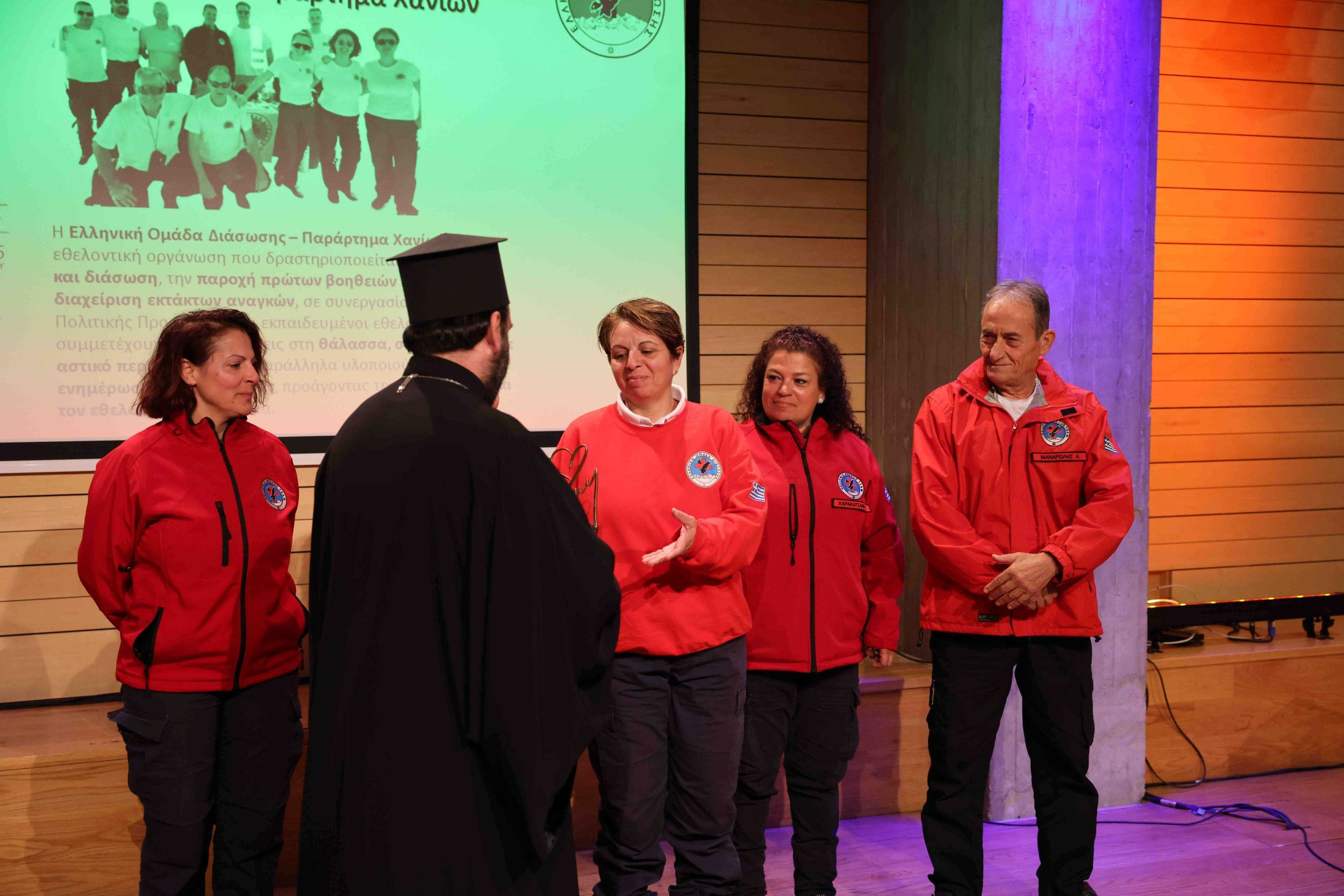 - στην Ελληνική Ομάδα Διάσωσης – Παράρτημα Χανίων, από τον εκπρόσωπο του Αρχιεπισκόπου Κρήτης, Πανοσιολογιότατο αρχιμανδρίτη πατέρα Κύριλλο Χριστοφή